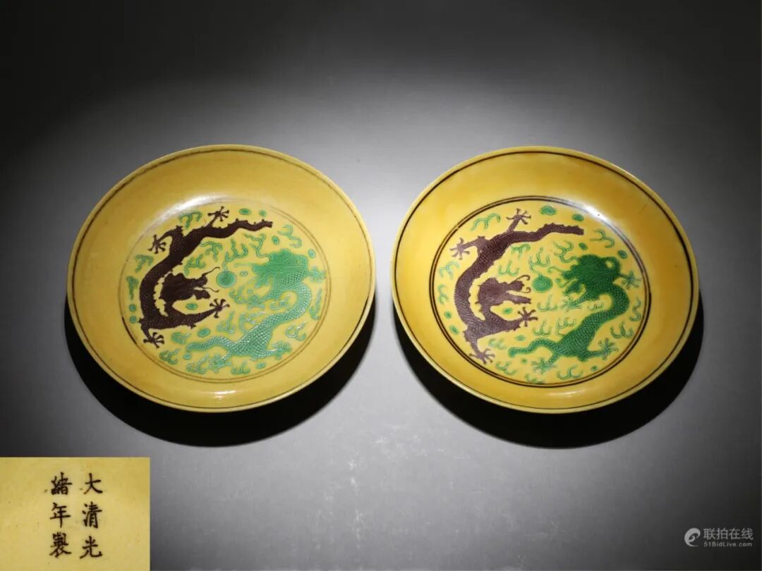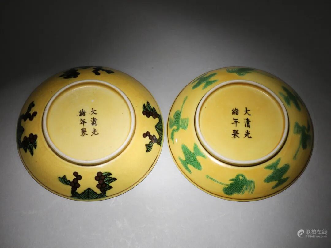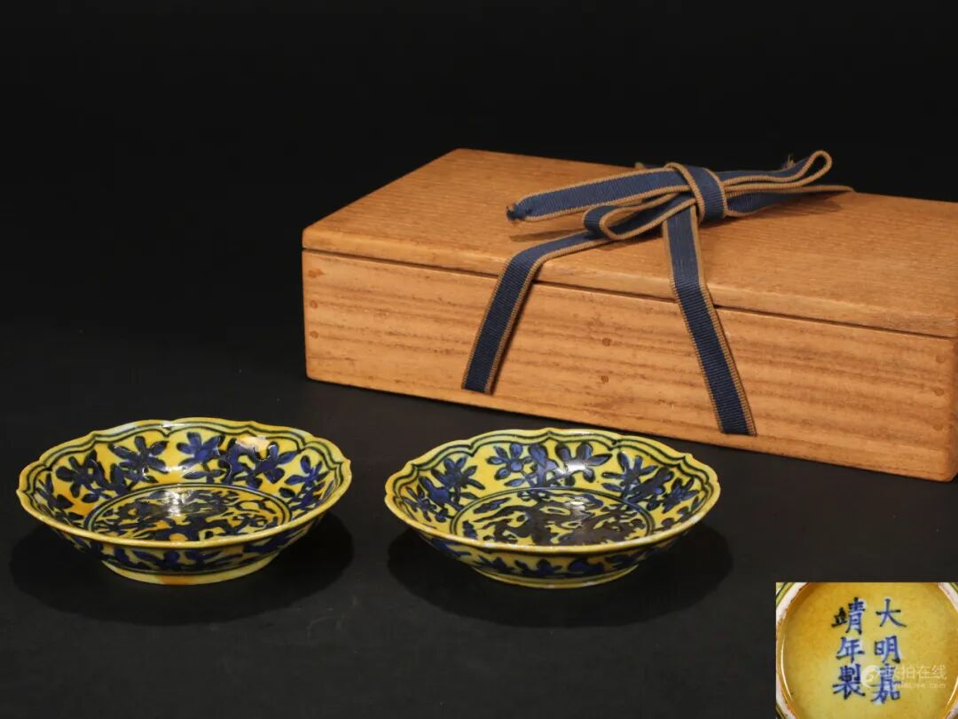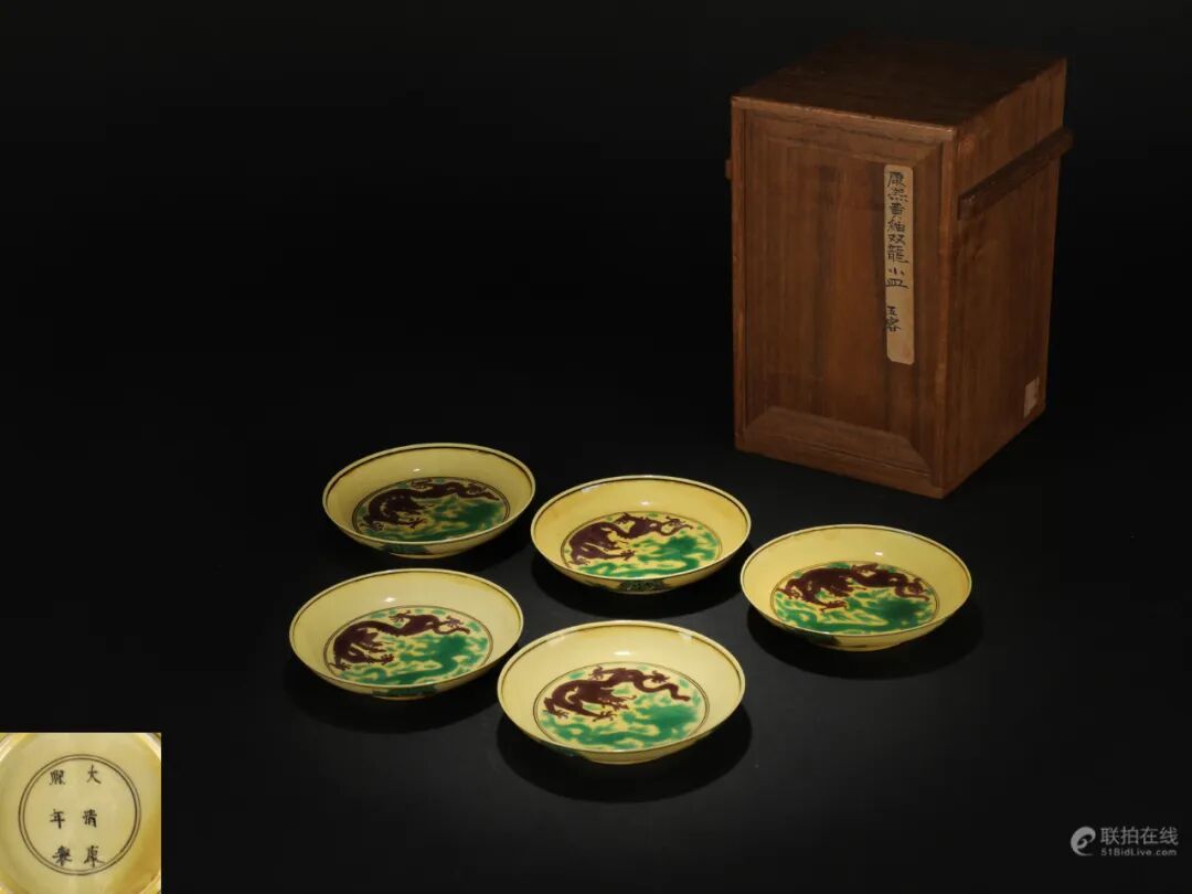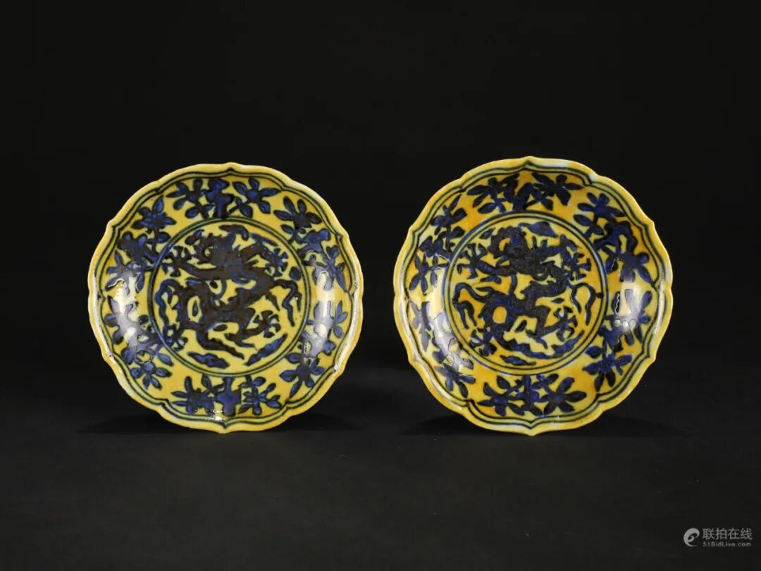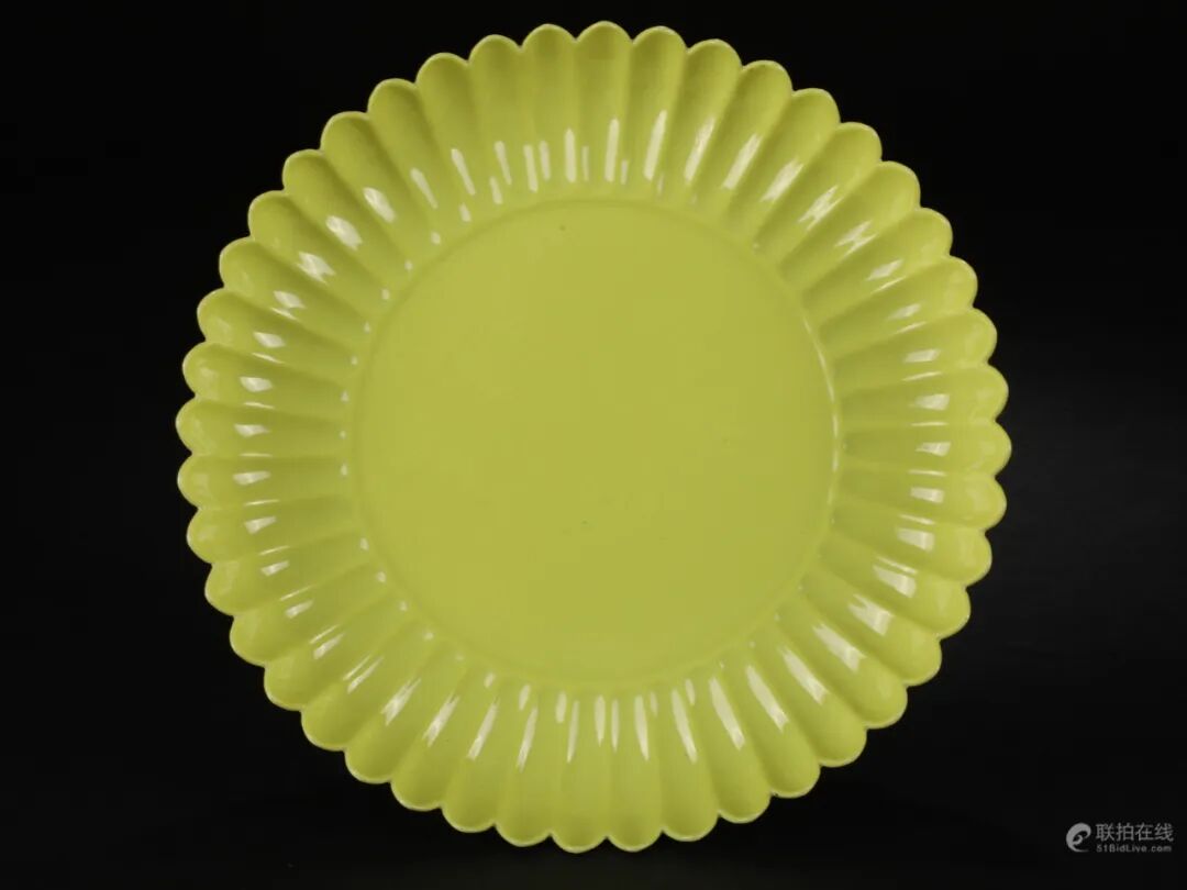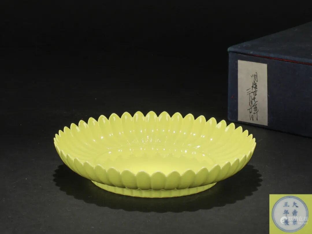 此盘敞口,盘壁呈菊花瓣状,圈足。通体施柠檬黄釉,足内施白釉,青花双圈内书「大清雍正年制」楷书款。据《清档.雍正记事杂录》记载,雍正十一年曾命景德镇官窑督陶官年希尧,烧造十二色釉菊瓣盘,年奉命督造各色器各四十件,见北京故宫博物院所藏一组十二色釉菊瓣盘,录于1999年香港出版故宫博物院藏文物珍品全集《颜色釉》,图版257。盘配原旧布盒,品相完美,为近年来市面上之黄釉精品。