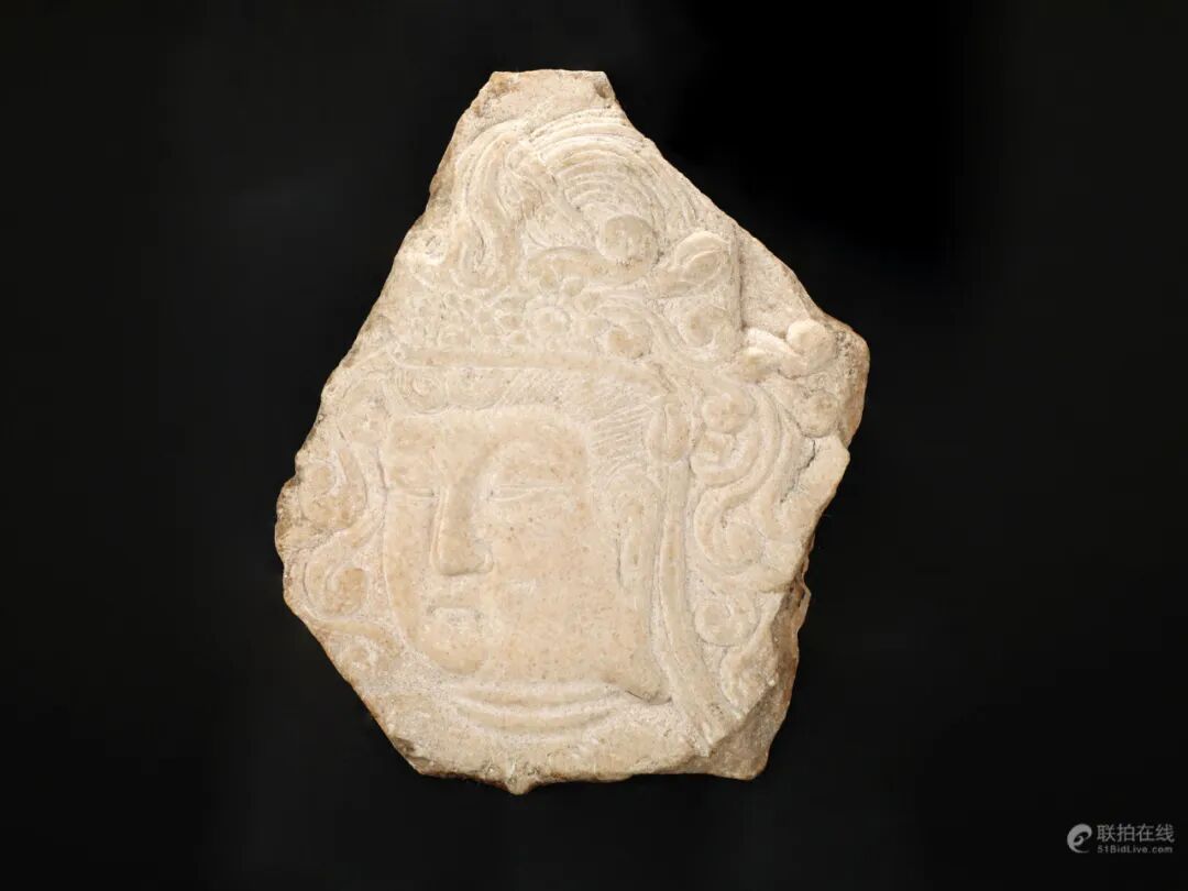 此尊佛头为东京壶中居旧藏。雕凿工艺精细,结构严谨。虽仅残留佛头部侧面。仍可以想见原件当是一件精美之作。此像发髻高耸面部丰腴,眉毛高挑,眼睑微开,作俯视状,鼻挺唇厚,嘴角微带笑意,下颚圆满,双耳垂肩,呈雍容闲静之感,表现了佛经中记载佛祖“三十二相,八十种好”。实为不可多得之贡奉佳品。