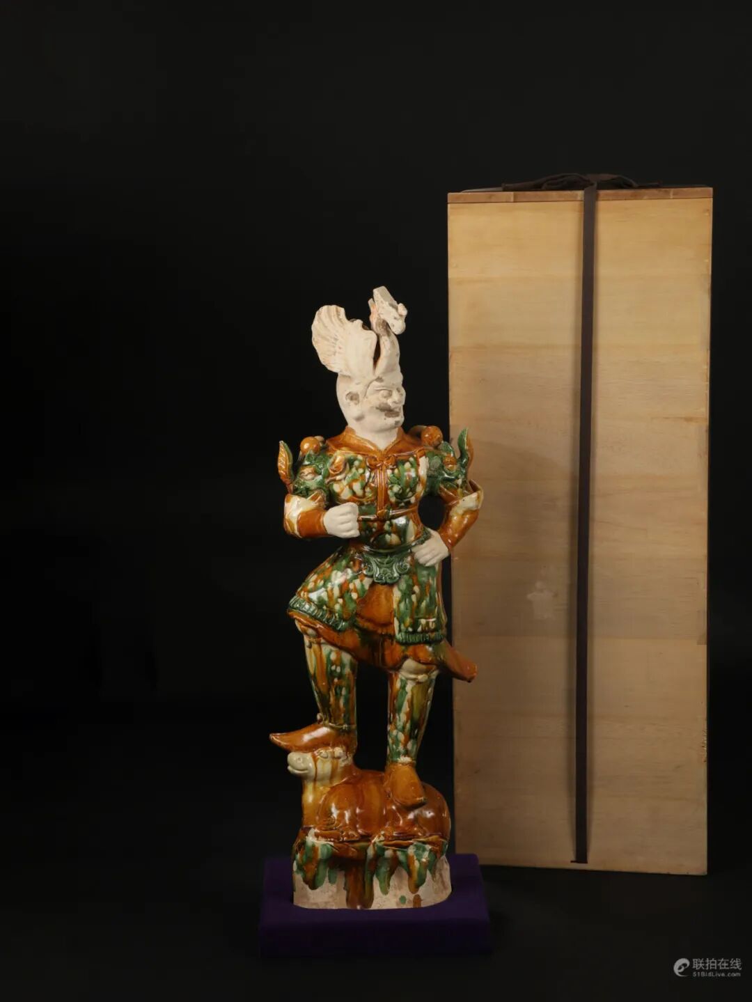 唐代三彩天王形象源于佛教文化。唐三彩天王俑多为左右两件成一对,通常脚下踩踏有牛或羊或神兽状,此三彩釉陶天王俑通身施以蓝、黄,绿、白四色釉,釉色流淌自然,相互交融。独留面部、手部、底座以彩绘绘制,使天王威猛之态更为传神。手中在原入葬时应持有法器,因年久而失。此尊虽有小伤,但收藏来源清晰,实为收藏之精品。