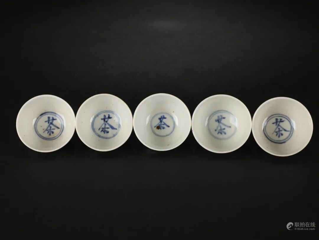 15.清 宜兴紫砂挂外蓝内白釉花口茶杯一套5件。