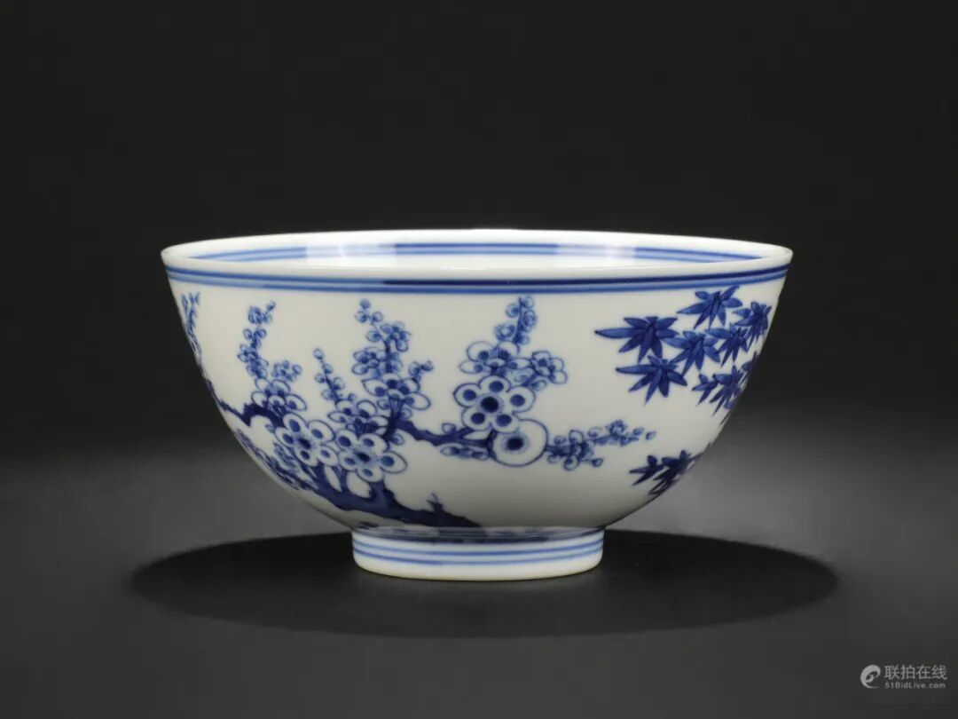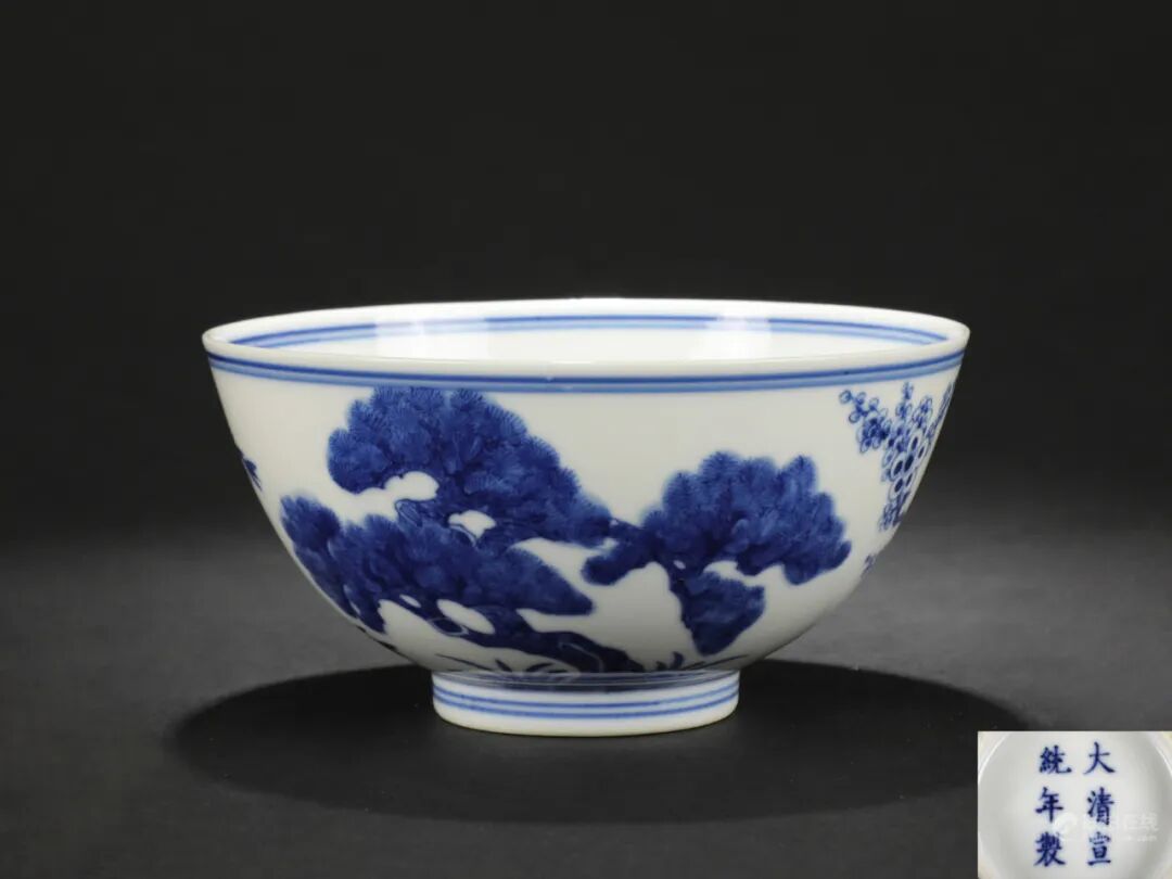 松竹梅也称岁寒三友。是明清官窑的传统纹饰,以其岁寒不凋的特性,比兴君子坚贞之德,而受到历代帝王的喜爱。此碗造型端庄,胎体细腻,施釉莹润。外壁分别绘松、竹、梅岁寒三友图,画意清高,布局饱满,笔触精道。宣统因历史原因而只有三年,而此碗品相完美,是较为难得之藏品。
