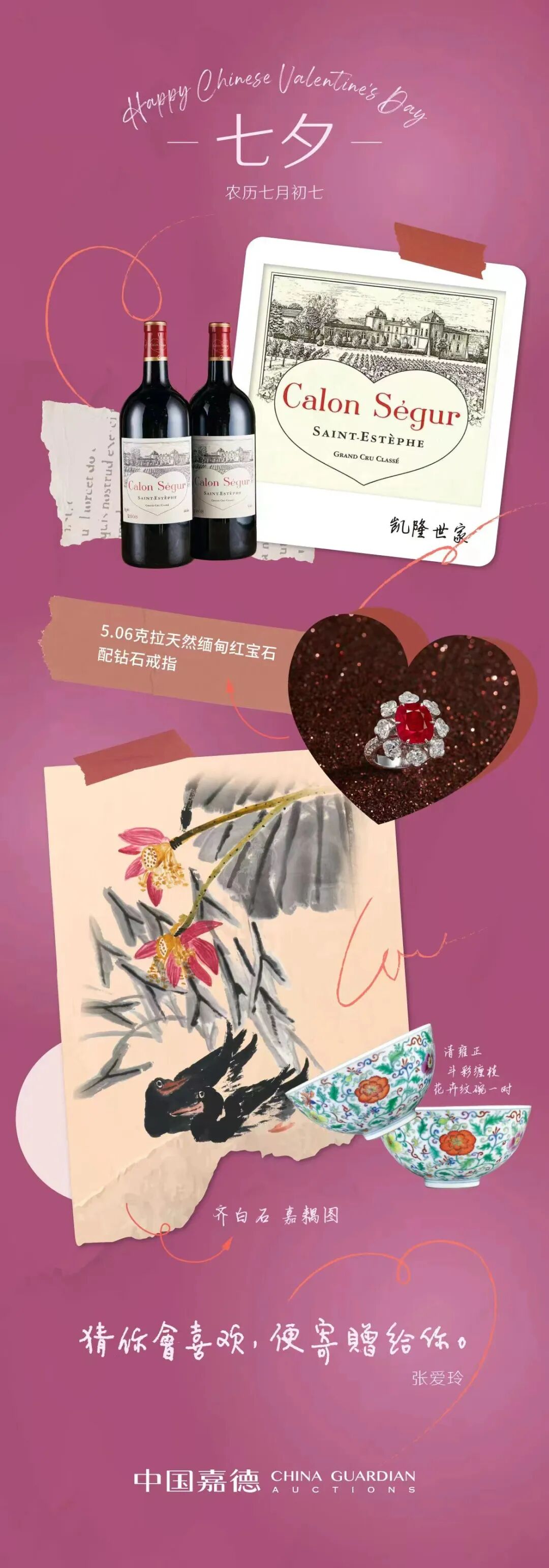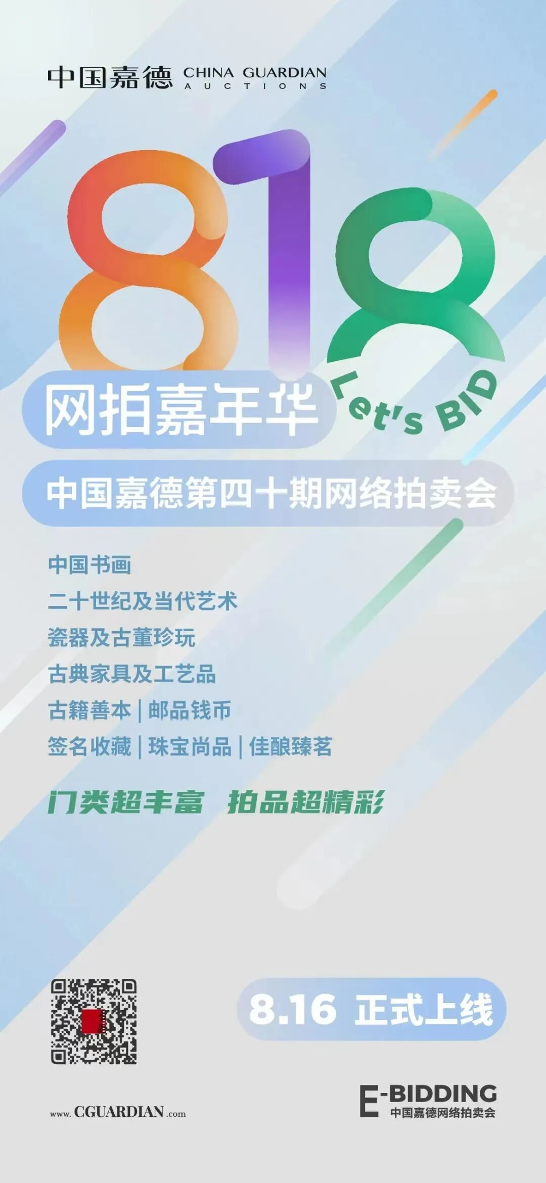 艺术品收藏恰如爱情,需要大胆追求,需要执着坚守,历久弥珍。中国嘉德“818”网络嘉年华暨第40期拍卖会将于8月18日启幕,不妨用一份爱的礼物,开启你的收藏之旅,让它成为爱的恒久见证,也为你的生活增添一份亮丽的颜色。