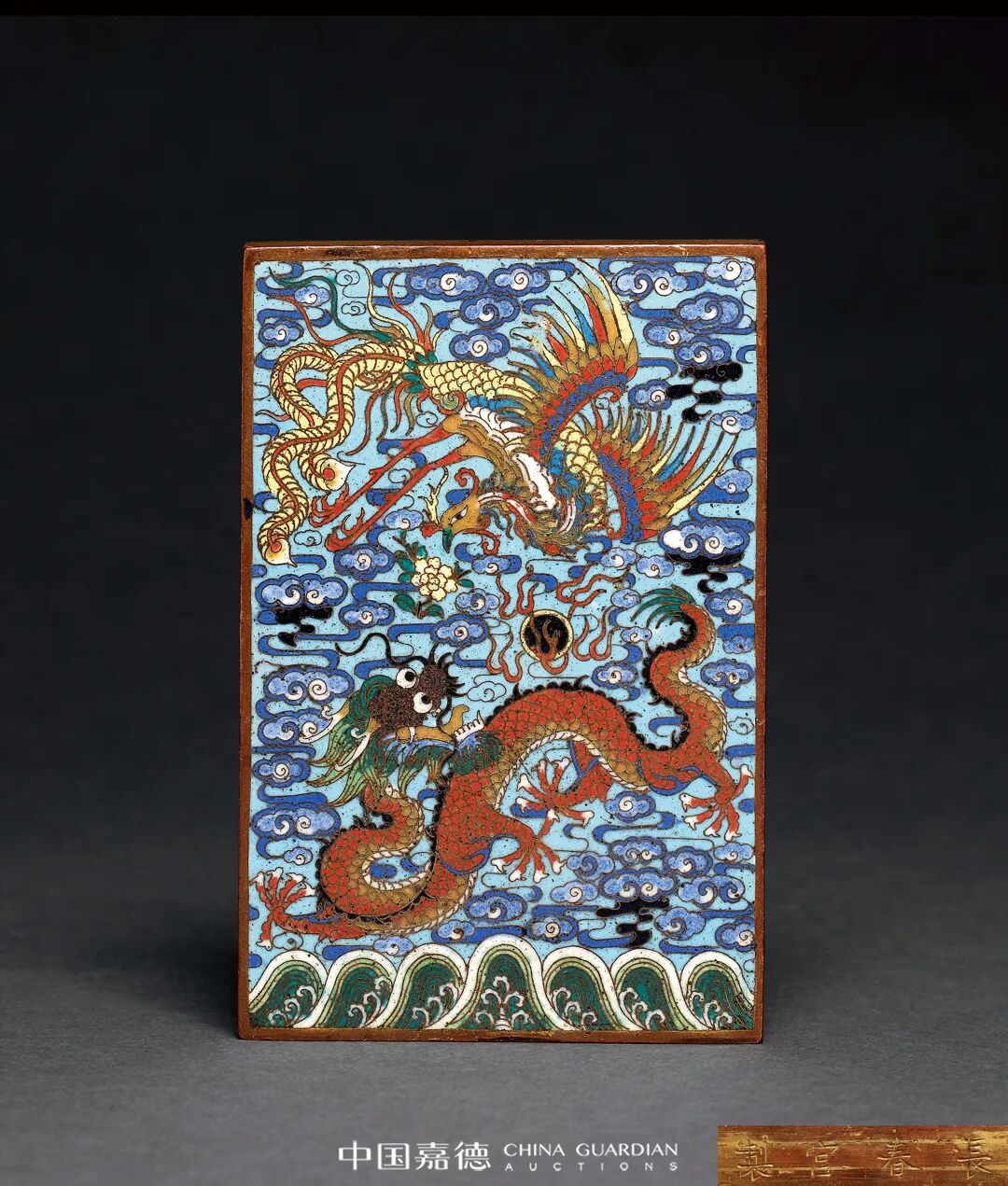 这件宫廷用珐琅纸镇形制规整,色彩绚丽。神龙双目炯炯,凤鸟优雅纤长,龙飞凤舞,祥瑞华美。可以作为纸镇,也可以作为插屏屏心,今天仍可作为桌上好物陈设使用,也具有传承赓续的价值。
