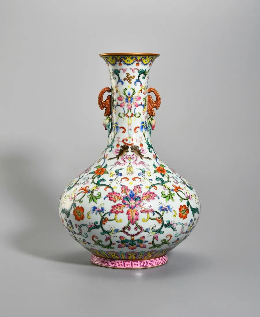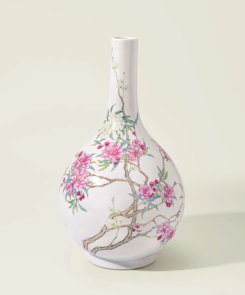 清乾隆 唐英制松石绿地轧道粉彩四季花卉图赏瓶