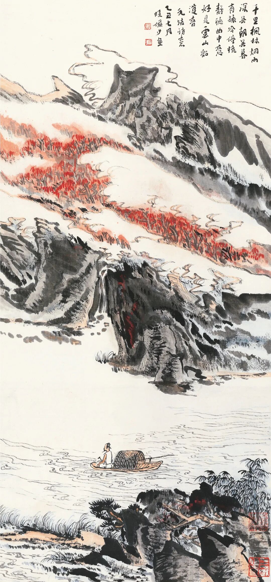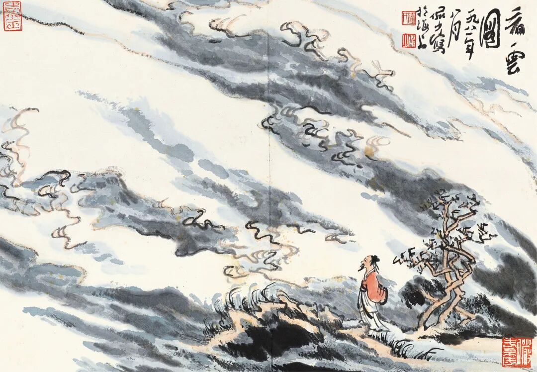 此次征集的《江山泛舟》、《元结诗意图》、《白云深处》、《十月江湖》等作尽呈浑厚苍润、犷放简约之态,个性鲜明,风格独具,不愧为名家妙手,神气洒然,堪称陆俨少八十年代的代表性作品。陆俨少所独创的云法尽显画中,勾云、墨块两法共享,凝练重拙、参差映带、蜿蜒曲屈、流畅圆转,静中有动,动中有静,别有一番神奇景象。