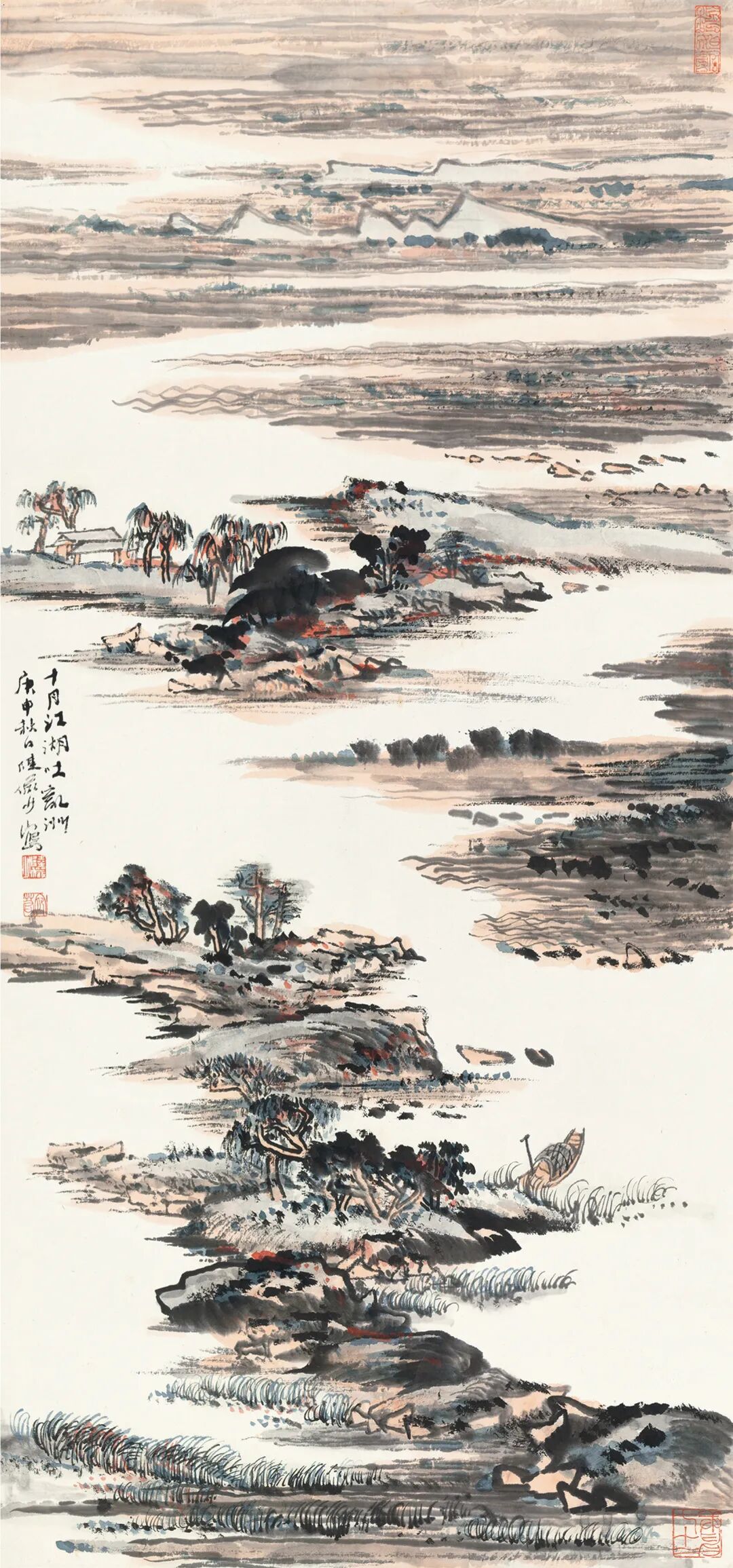 款识:十月江湖吐乱洲,庚申秋日陆俨少写。