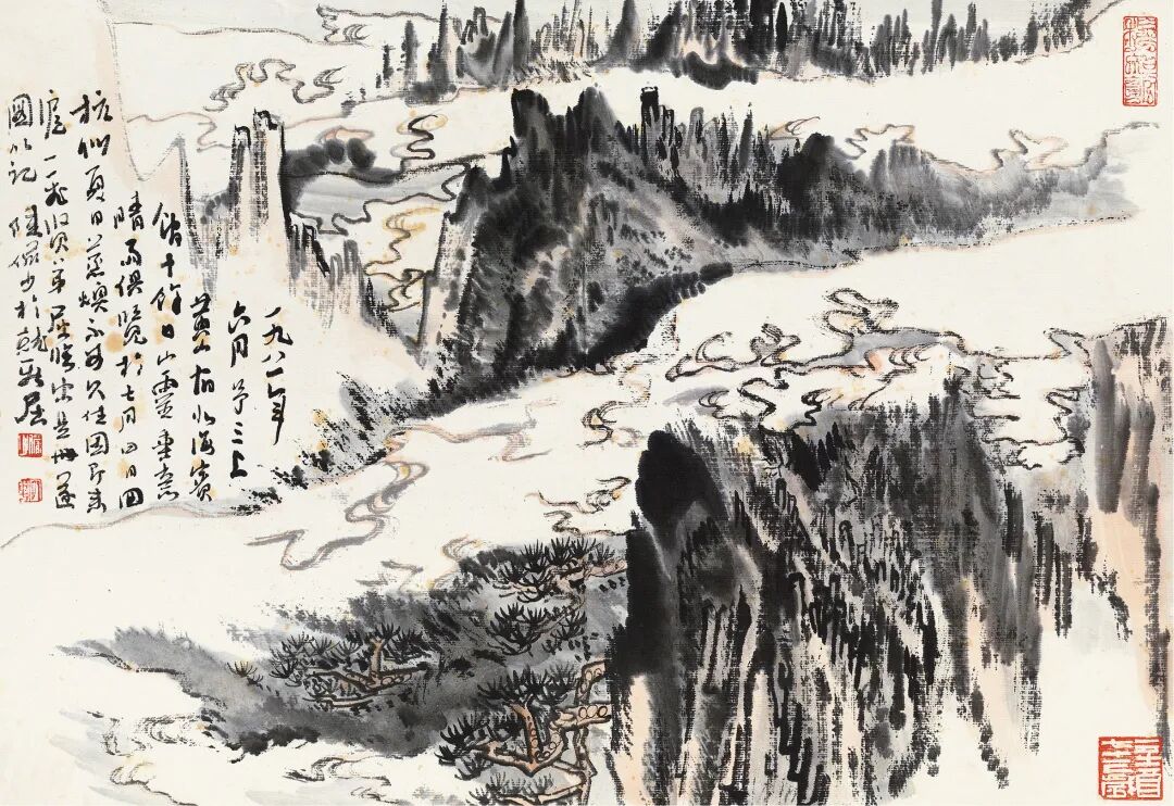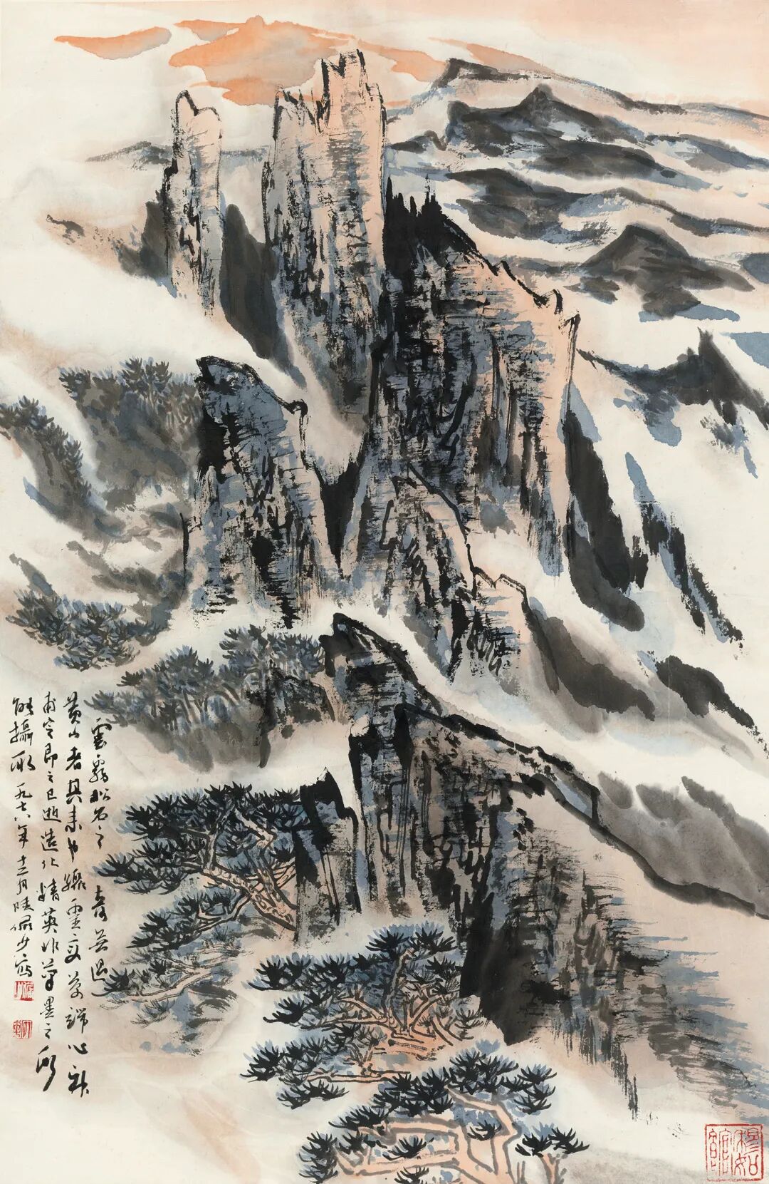 款识:云雾松石之奇,无过黄山者。其来也骤,灵变万端,心神甫定,即之已逝,造化精英,非笔墨之所能摄取。一九七八年十二月。陆俨少写。
