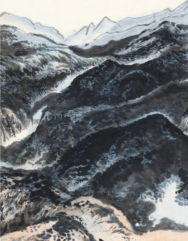 在《皖南风光》中,陆俨少经典的“留白图式”初见端倪。山峦间、丛林间以极富层次感的留白表现氤氲云气,这种极富律动感的留白在山川丛林右侧的端口形成若干支点,并向右蔓延出面积更大的留白。这种处理方式平衡了画面上部群山和下部密林处,因施用重墨以增强作品厚重感与质量感而可能使之造成的壅塞滞坠的感觉,将墨与色之间的气氛活跃性充分的调动融合,以此来阐发毛主席词意中所蕴含的诗学美感。