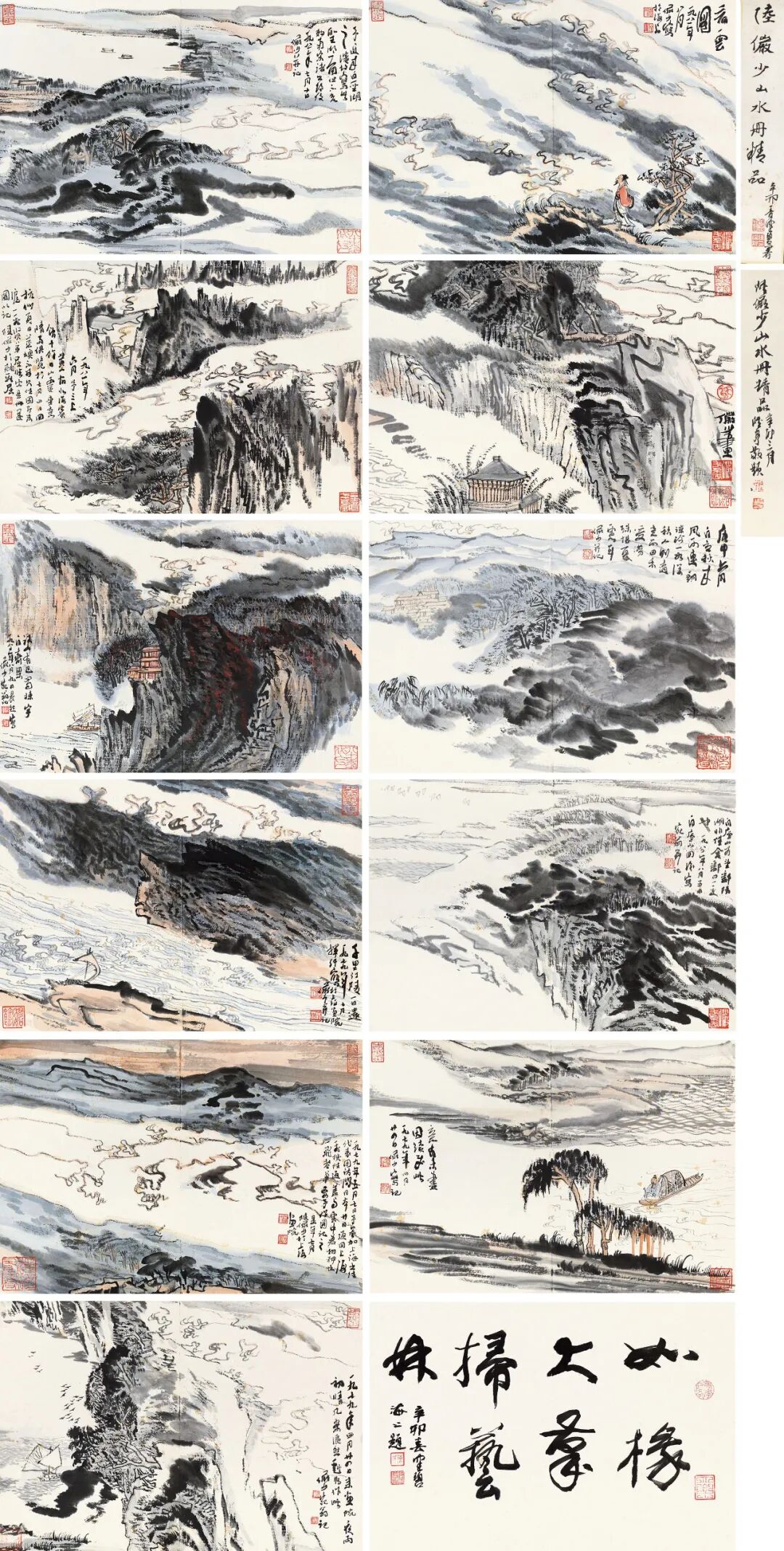 《江山胜景册》共十一开,二十二页余。为陆氏鼎盛期所作。在此作品中,陆俨少独创“墨块”“留白”勾云法强化了画面中山峦峰霭的变化。时而缜密端秀、灵气外溢,时而朴厚老辣、生气远出、妙造自然、真情袒露、天然横生。