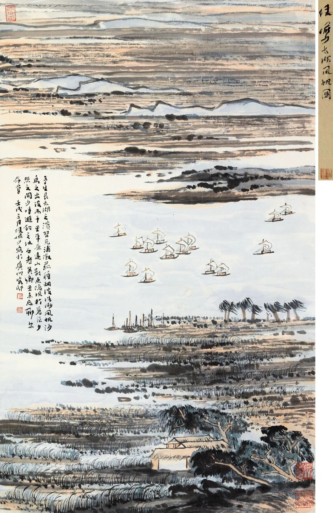 释文:予生长太湖之滨,习见浦溆菇蓓,烟波浩渺,风帆沙鸟之出没。而千里平原远山数点隐现于苍茫夕照之间。少时游钓之地,今老矣,乡思未忘聊尔命笔。