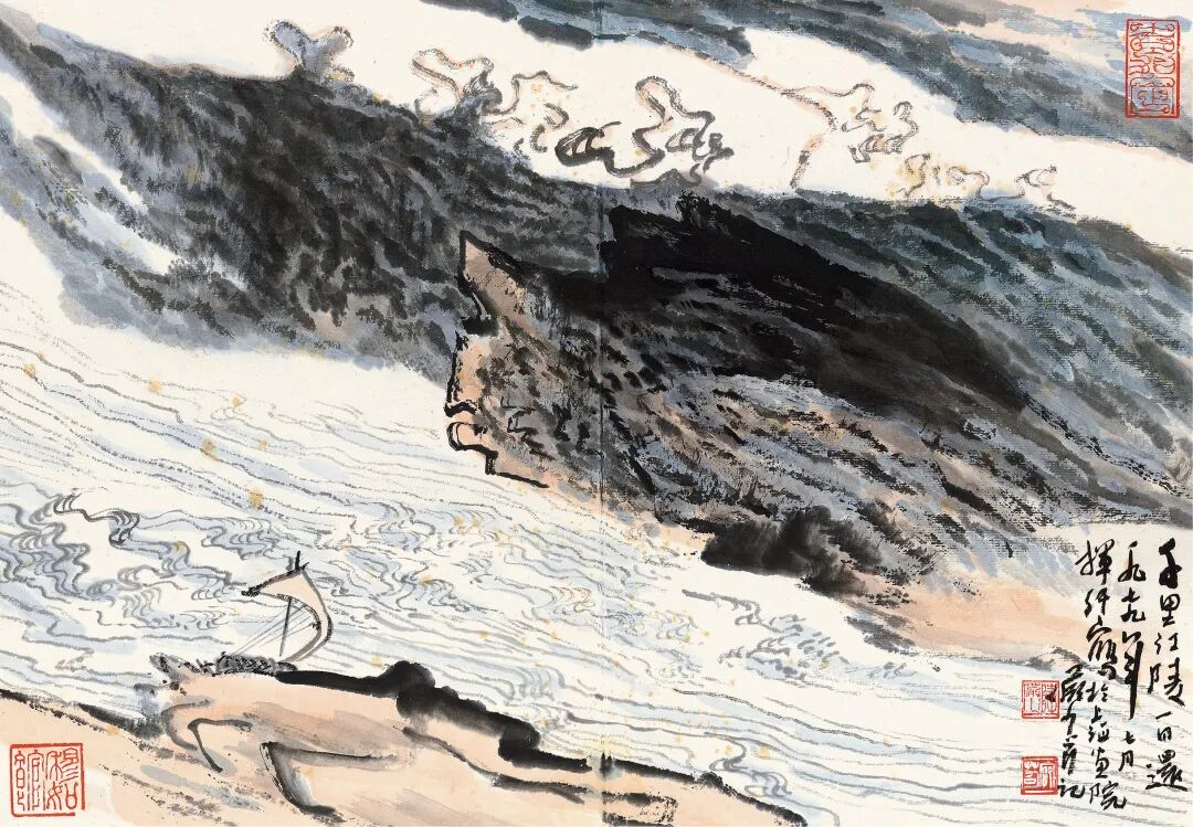 在此作品中,似有敦煌壁画的画法,在云纹转折处,颇似陈老莲的变形之法。再看勾水,对江峡、礁石的水态,各种变化奇妙无穷,平滩以花青和淡墨相杂,线条疏朗,峡江浓淡墨交互使用,似密不透风又杂而不乱,险礁的激流处全用花青打底,显露出悬崖阴霾险峻的状态。
