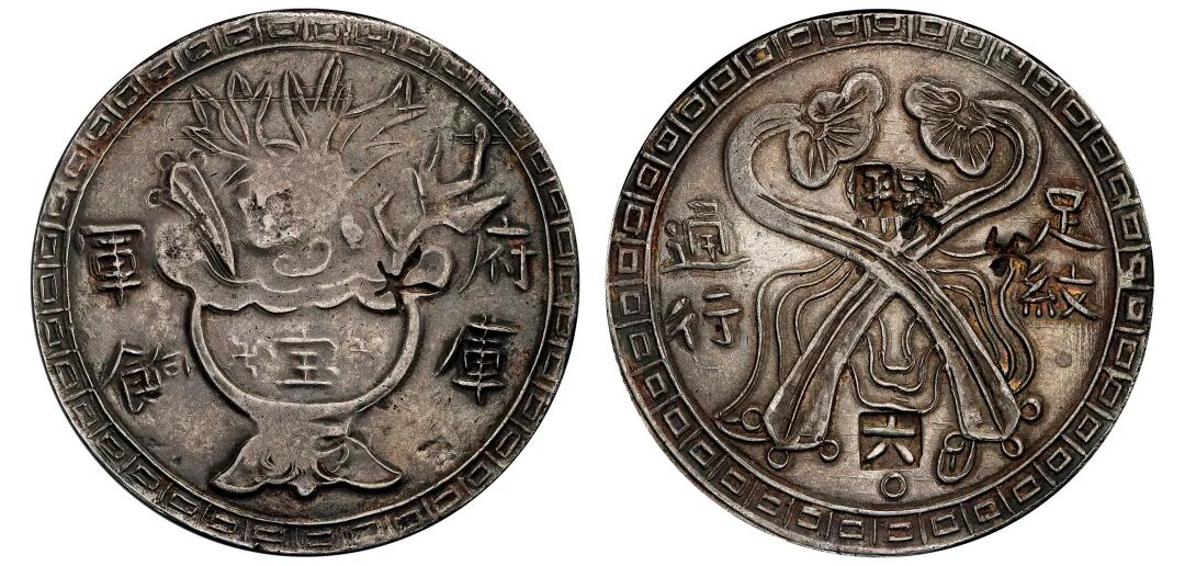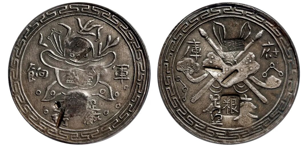 道光十八年(1838),台湾府在台南首铸“老公银”流通于市,系台湾地区最早的圆形银货币,铸期十余年,因使用粗制铁模打造,模具寿命不长,修模频繁,故有多种版式。而“如意”“笔宝”银饼,则是咸丰三年(1853)台湾府应“林恭事变”之需铸造,铸行时间短暂,且大多被熔毁改铸,时至今日已十分少见。是次春拍,上述三种台湾银饼齐聚,“老公银”无任何流通戳记,以PCGS唯一MS级评分傲视群雄;“如意”“笔宝”亦验印极少,底版基本完好,品相拔众,多品种精品同现机遇难逢。