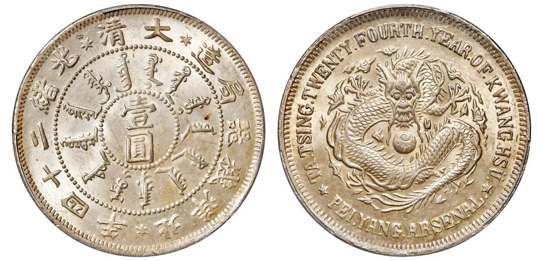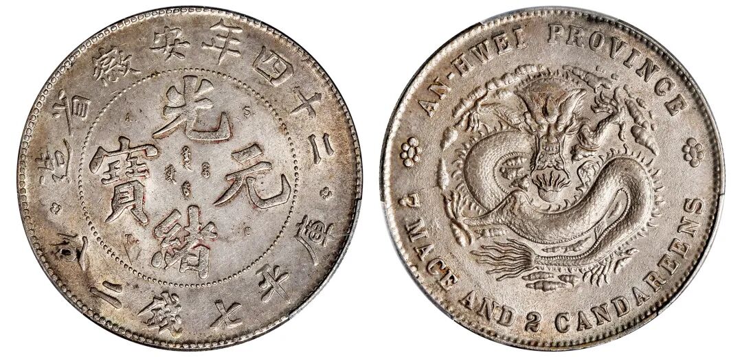 安徽银元局开办仅一年有余即奉旨停产,所铸各版银币存世皆少,二十四年所造尤为特别,同为1898年制作,却有“二十四年”及“戊戌”二种纪年,而前者又有“A.S.T.C.”及无英文二种版别。同一年份却有多种款式之情形在清代龙银中十分罕见,也为后世收藏平添更多乐趣。以上两枚银币为其中品相上乘者,前者包浆均匀,原始状态极佳;后者底版无瑕,原光靓丽,完美状态罕有其匹。