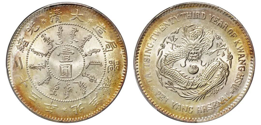 北洋机器局即清代三大兵工厂之一的军火机器总局。该局于同治六年(1867)在天津开办,光绪二十一年(1896)改称总理北洋机器局,次年底开制银币。开办初期所制银元面额即采用“圆”“角”计数,不同于他省以“两”“钱”计重,可惜发行时间很短,仅有光绪二十二、二十三、二十四三种年份,存世数量皆少。以上两枚北洋机器局银主币铸打不俗,包浆动人,皆获PCGS冠军分,令其他同品种银币难以望其项背。