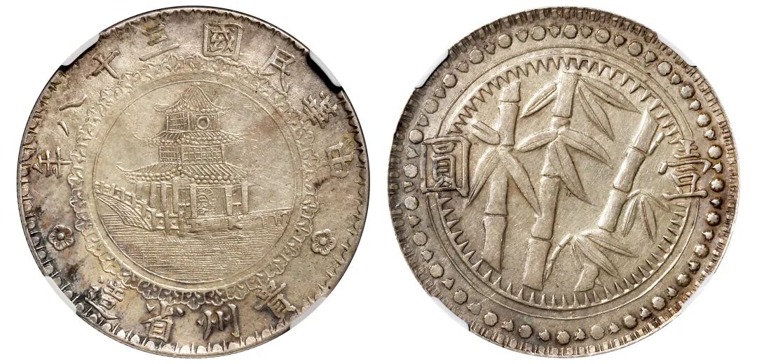 抗战结束后,通货膨胀加剧,纸钞信用一落千丈,国民政府于1949年7月初公告恢复银本位制,并重新铸造“船洋”银币流通于市。其时贵州已无造币厂,省财政厅沿用周西成时期留下的部分机器设备,自行开工制造各类银、铜币,交由贵州省银行发行。此款自制银币俗称“竹子币”,设计风格具有浓厚地方色彩,正面为贵阳名胜甲秀楼,依上层窗户形状可分圆窗、方窗两种版式。“竹子币”生产时间甚短,红军由湘西进入贵州省天柱县后,造币厂旋即停产,据报仅制成万余枚,流传至今已非常少见。