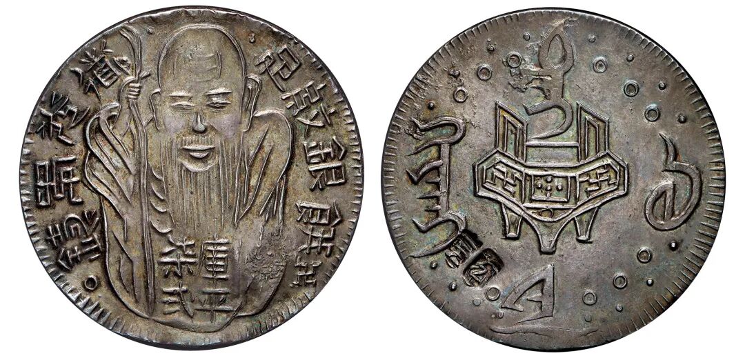 光绪十三年(1887),两广总督张之洞奏准新法制钱,向英国伯明翰喜敦造币厂订购机器设备,成立广东钱局,率先尝试以机器铸造银铜钱币。模具由英国著名雕刻师艾伦·韦恩设计雕刻,为了方便与外商交易,将英文置于字面,习称“广东七三反版”,但在流通过程中,却因分量稍重、含银较多反被囤积私毁,亏耗严重,只短暂生产,制成品大半被回炉改制,留存至今者早已成为业界趋之若鹜的名珍。此枚英国伯明翰喜敦造币厂原铸的镜面版精制样币,制作工艺超群,底版光亮如镜,SP64之高分于PCGS榜单独占鳌头。