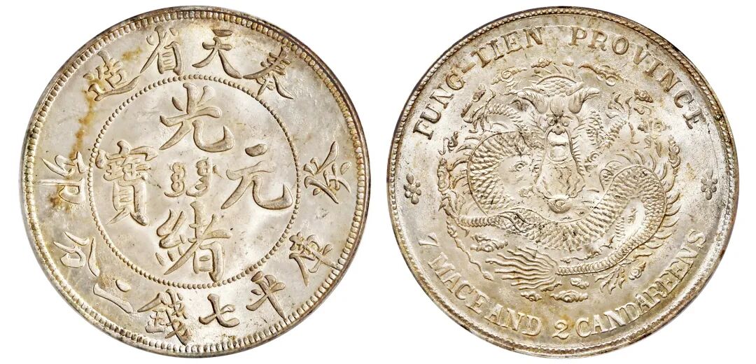 奉天制造银元总局于光绪二十九年(1903)十月开铸“癸卯奉天省造光绪元宝”纪年银币,只铸行一年便因日俄战争爆发停铸,制成数量稀薄。此版银币依中央满文不同,可分“宝奉”“奉宝”二种版别,前者远少于后者。据资深人士对2011至2021年海内外公开拍卖的数据统计,近十年来,“宝奉”版出现比率大约是“奉宝”版的三分之一,其中MS级佳品屈指可数。此枚“宝奉”为钢模初印,龙鳞满打,底版无瑕,柔美粉光皎如秋月,以绝无仅有之精美度,位居PCGS评级榜单首位。