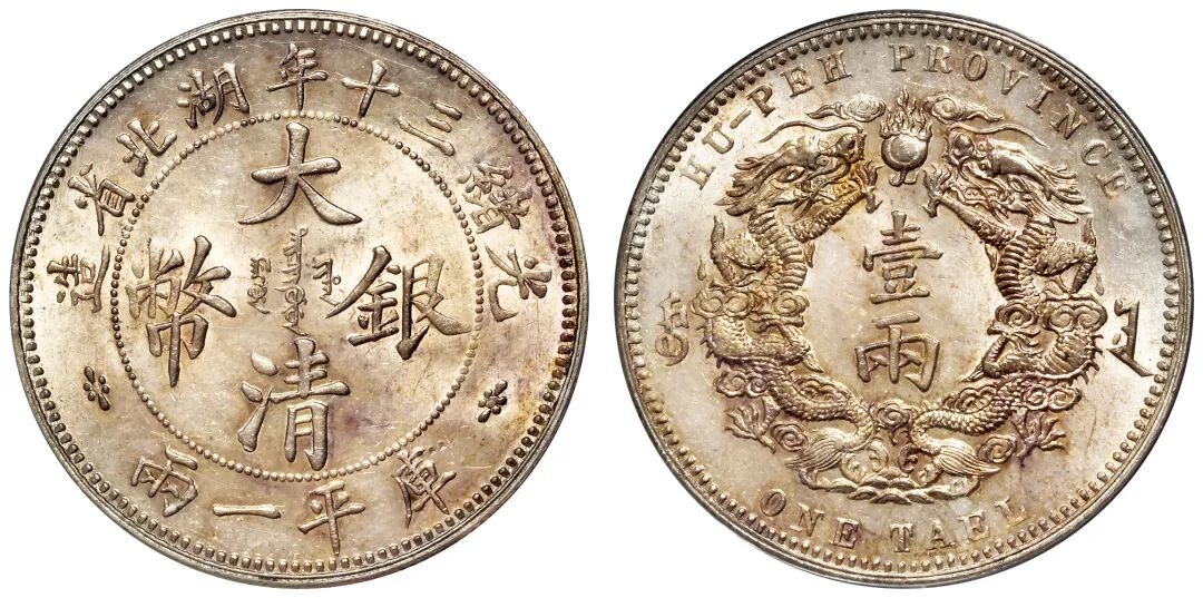 光绪三十年(1904)八月,湖广总督张之洞奏请在湖北试制一两银币获准,随后,湖北银元局改名为银币局,开始制造新银币,模具由日本大阪造币厂承制。“湖北壹两”最早于币面铭文“大清银币”,也是流通币中,除吉林“厂平壹两”外唯一的“两”制币,但短暂发行后即被收回。“湖北壹两”银币依正面“大清银币”字体大小,可分为大字、小字两版,前者更为少见。以上两枚“湖北壹两”可谓其中拔萃之品,铸打出色,包浆悦目,绝佳品相动人心扉。