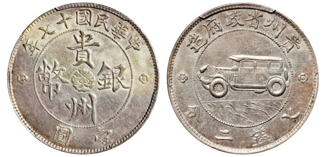贵州省政府主席周西成因酷爱汽车,借贵州首条省际公路竣工通车纪念,将其座驾——美国哈德生(Hudson)牌软顶汽车,设计镌刻于银币之上,车下以草叶巧妙勾划出“西成”二字,俗称“汽车币”。这是世界上唯一以汽车为图案的流通银币,在国际钱币界亦具有极高知名度,由于铸造数量不多且为行用币,佳品所见极少。此枚不仅铸打精美,而且浆色轻薄,币面满溢原铸银光,品相殊为难得。