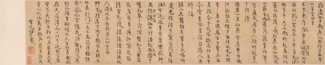本卷诗稿内容主要描写了庐山的壮丽景色,以及对生命易逝的感慨。书法上以篆隶入行草,通篇绵柔游转,笔势飞动,开合有度,较一般书法更为自然流露。