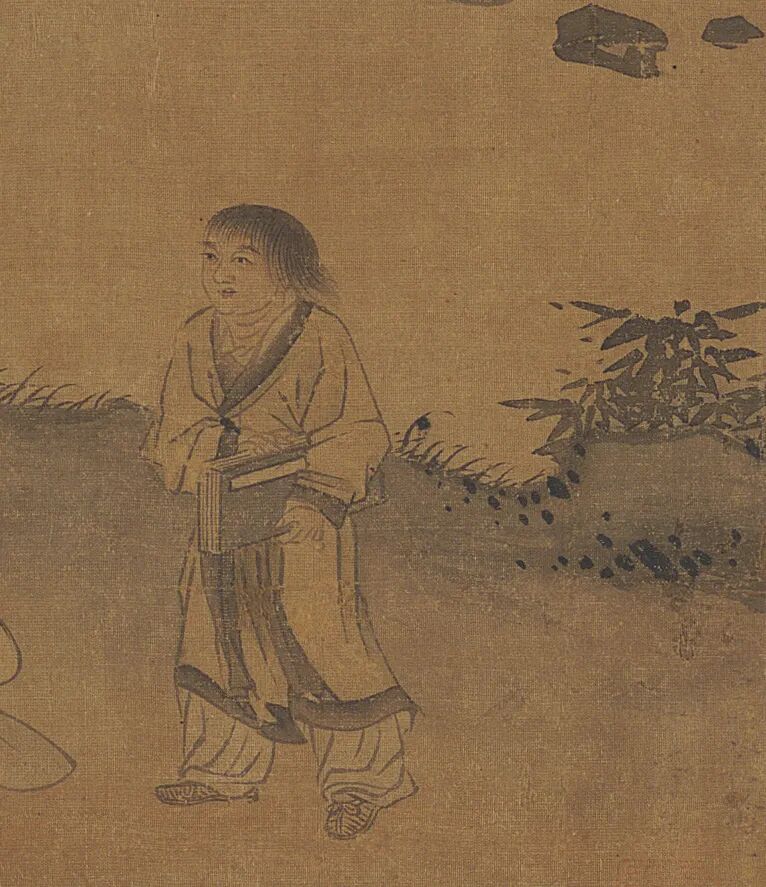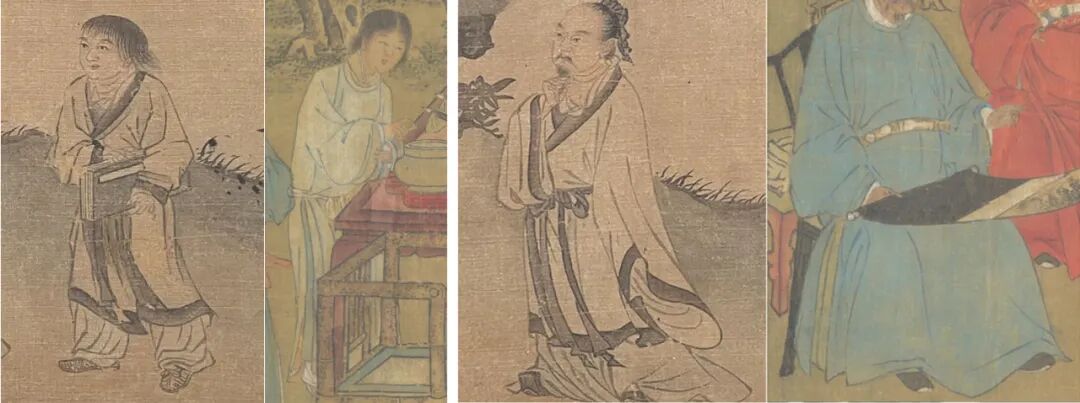 《竹林高士图》从服饰而观之,「方靴」、「草鞋」、「散发」符合元末明初的 服饰特点。在明朝鞋履中尚有锦衣卫外出「身着草履」之制度。比对谢环《杏 园雅集图》可知时代特征相吻合。