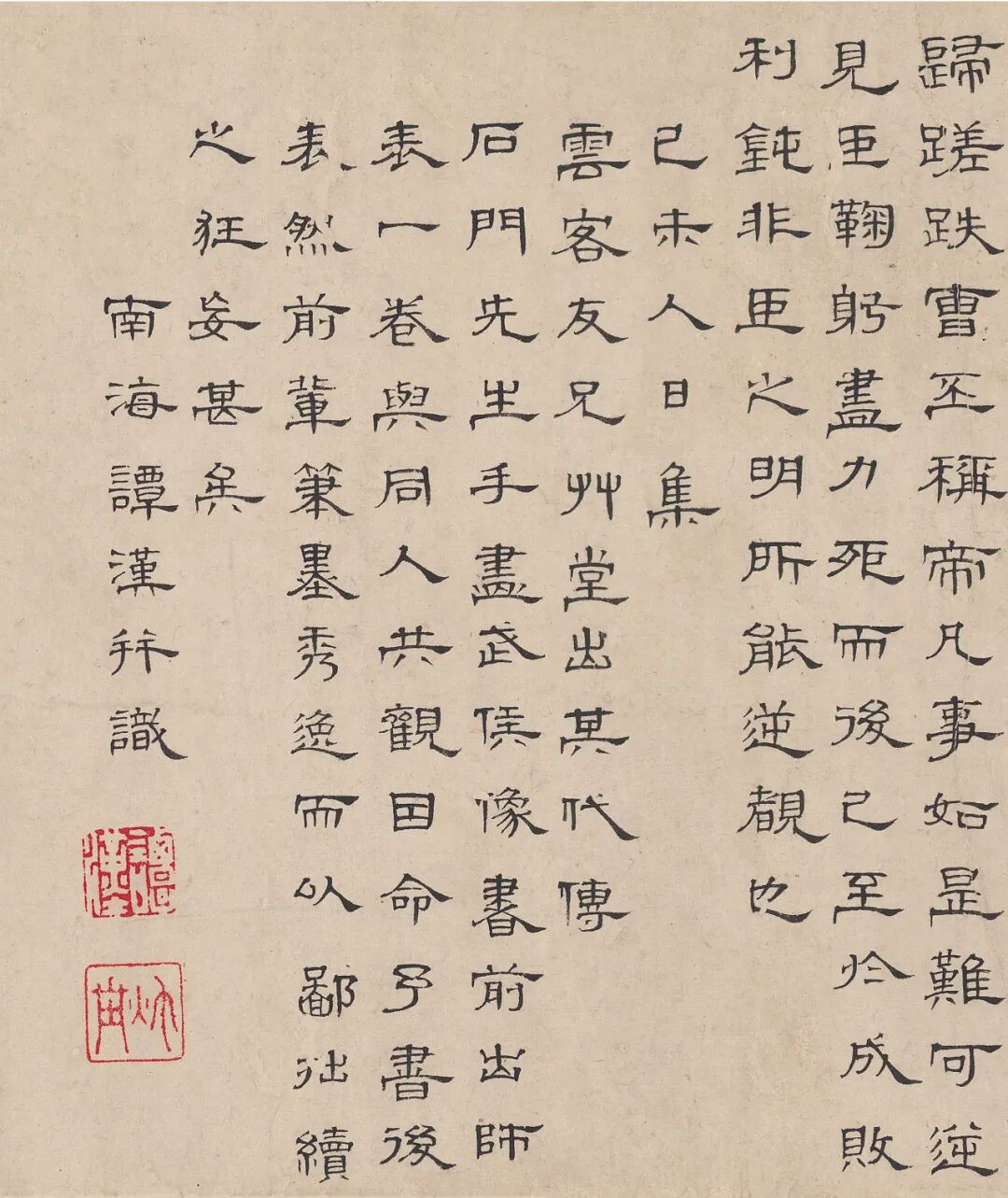 高瀔隶书继承了唐、宋以来的隶书风貌,受到了典型的石经体隶书影响,与清代隶书不类。无论是对比明初沈度隶书,还是对比吴门隶书,均可看到瀔书纯为明风,功力直抵沈度。谭汉隶书有《曹全》之风。
