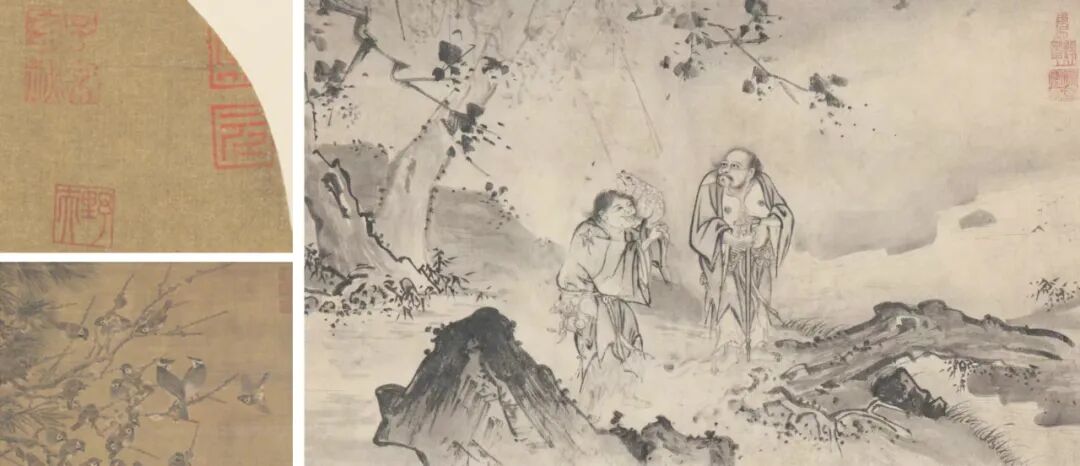 本画未署款,仅钤“朱氏孟渊”“心手相师”“无声诗”三印。不落款只钤印是南宋至明早期的传统,克利夫兰艺术博物馆藏同为莆籍画家边景昭的《三友四喜图》,广州博物馆藏的戴进《二仙图》,皆与本作不落款只钤印的情况相同,且钤印位置也与本作相同,位于画面右侧上部。
