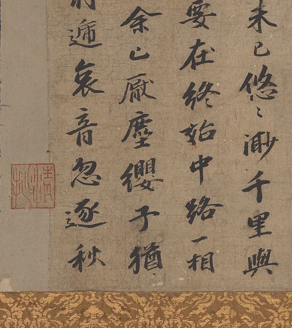 此作以特质粗绢书就,适合于表现张瑞图此期点画无意工拙、转折退去棱角的书写习惯,这也符合于张瑞图进入崇祯年(1628)后的书写特征:字与字相对独立,删繁就简,用笔简率平直,凸显出这一时期张瑞图淡然归禅、淡泊萧散的人生态度。