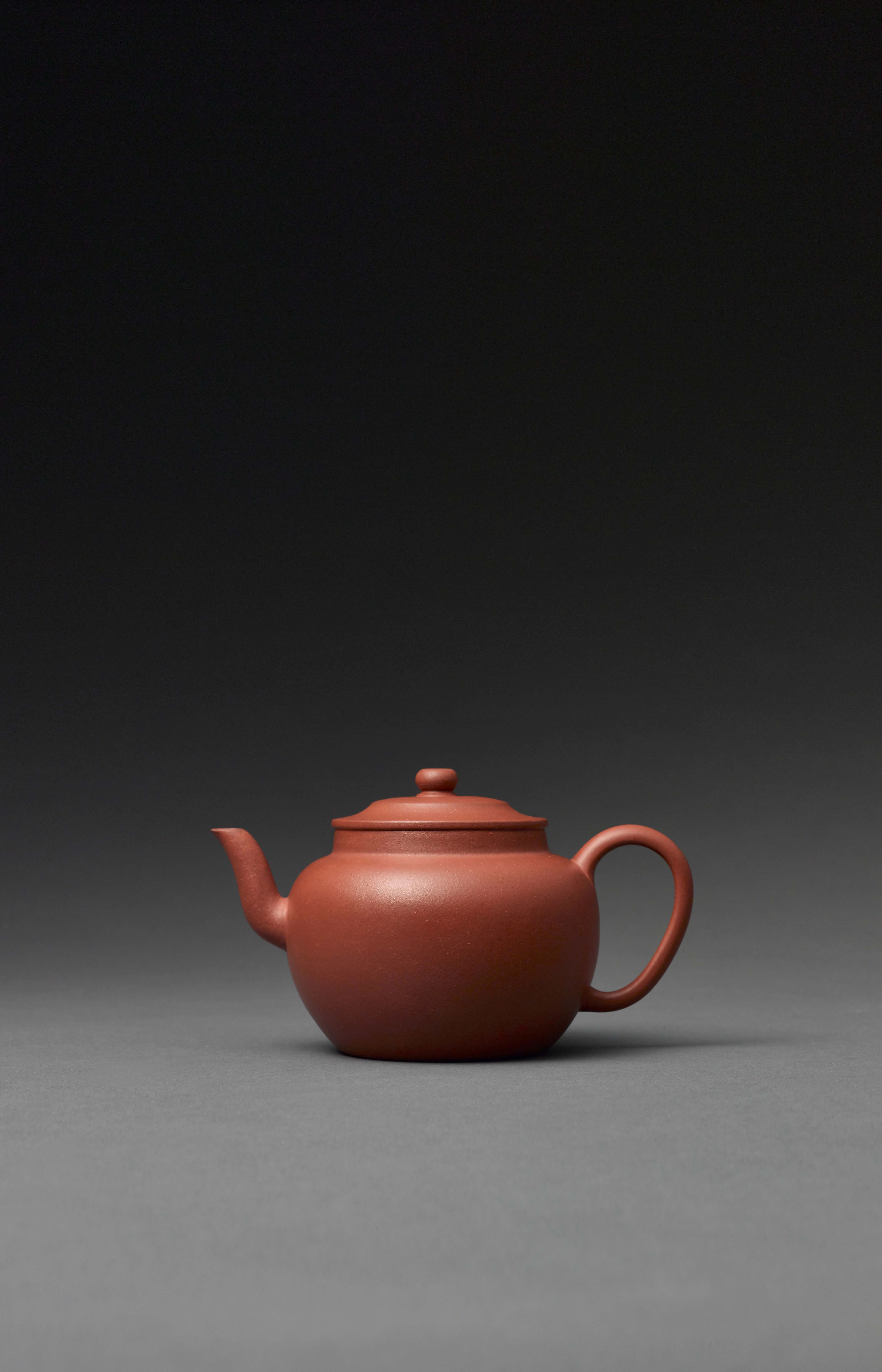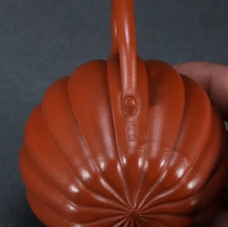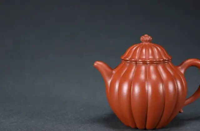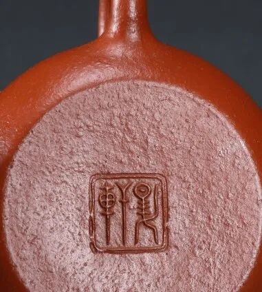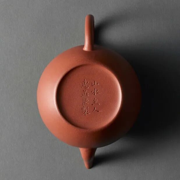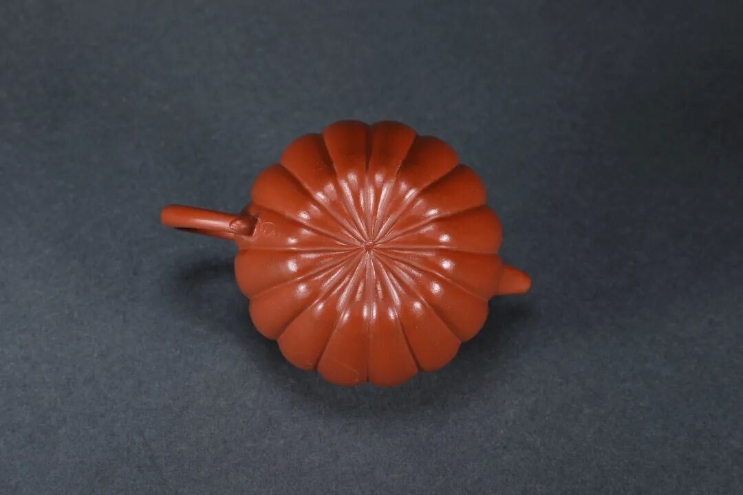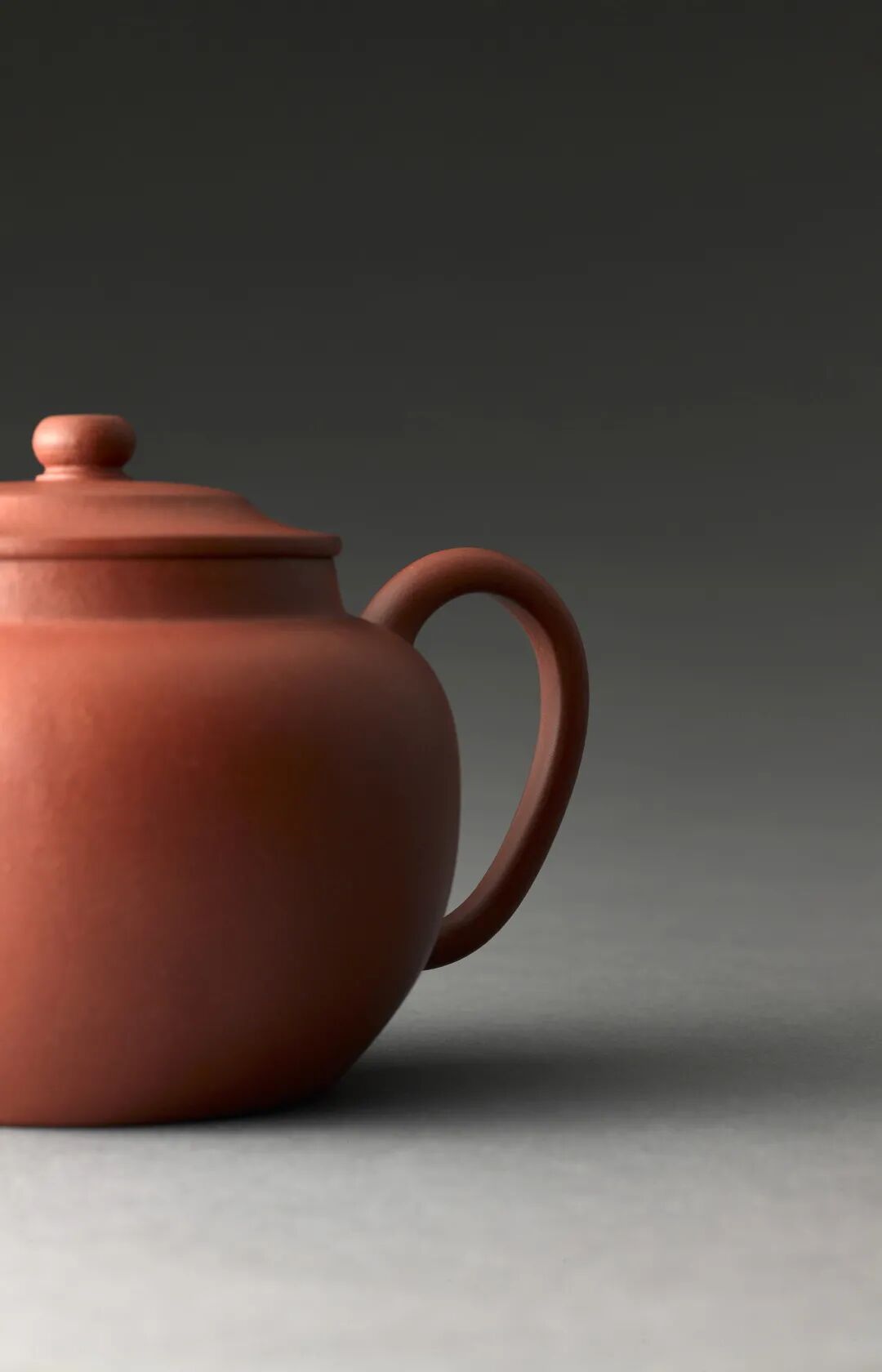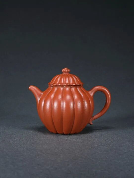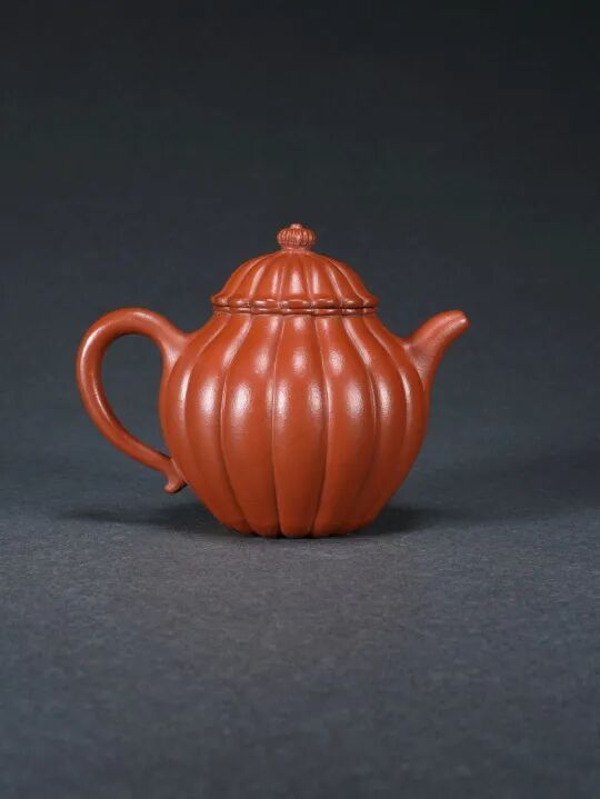 此壶流嘴上挺,壶把亦作昂扬,泥胎嬌紅,自壶盖顶珠延至底部内包收束点,可强烈感受其辐射状的脉络张力,徐徐律动。尤其是此泥胎色泽之优,与光素器相比,更具丰富之美,不可方物。
