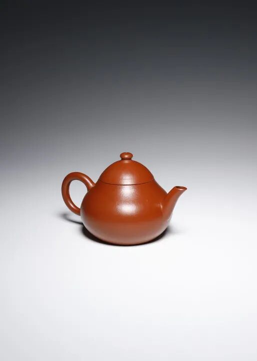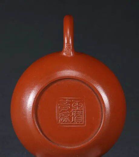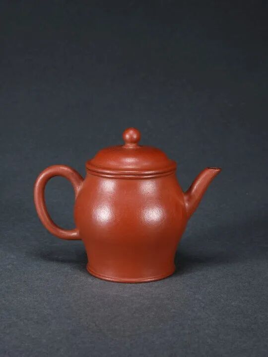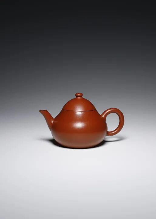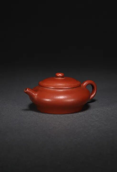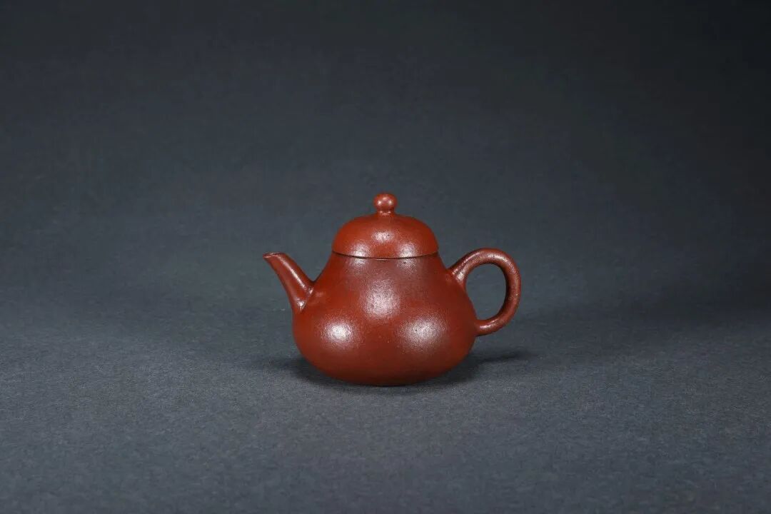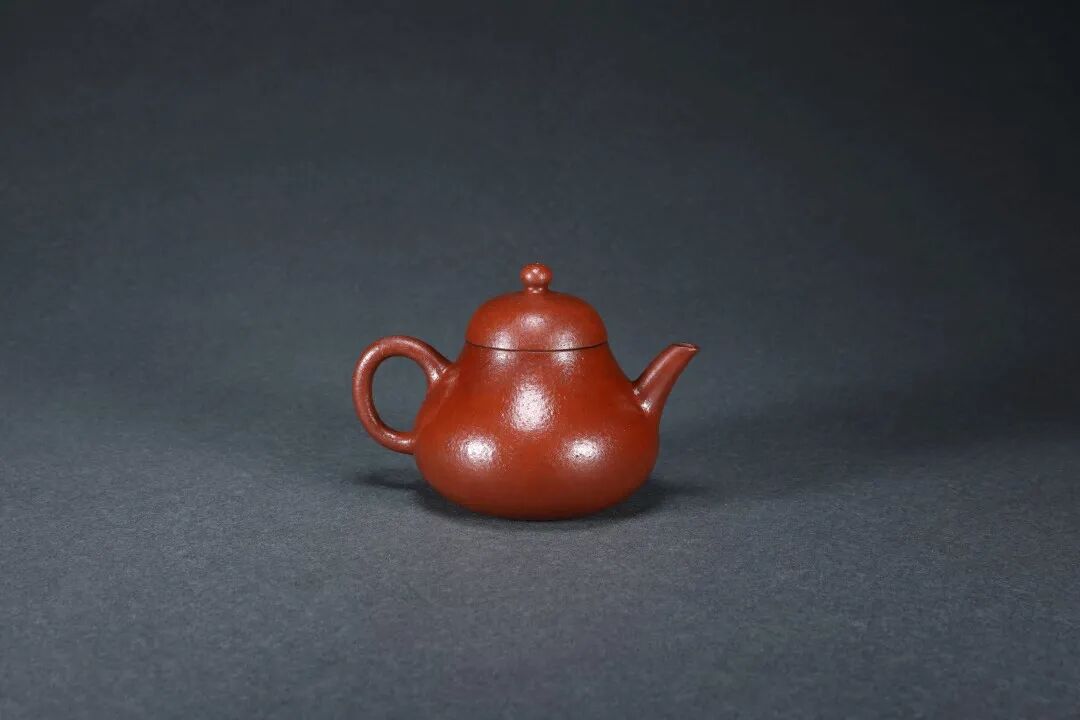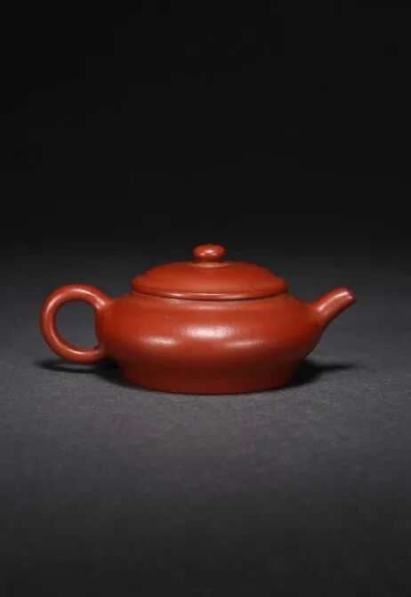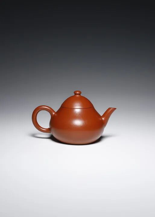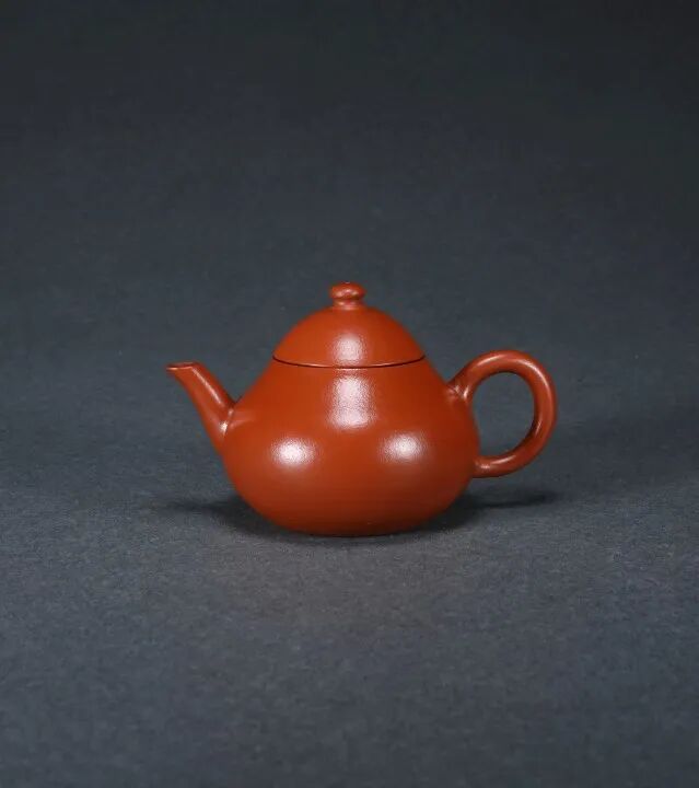 此壺用泥精純,窯溫適足發色殷红,轻巧精致。盖为笠帽式,口沿外撇,宝珠钮,流及把略微纤细,以凸显壶身的张力,同时于人玲珑美,具有鲜明时代特色。