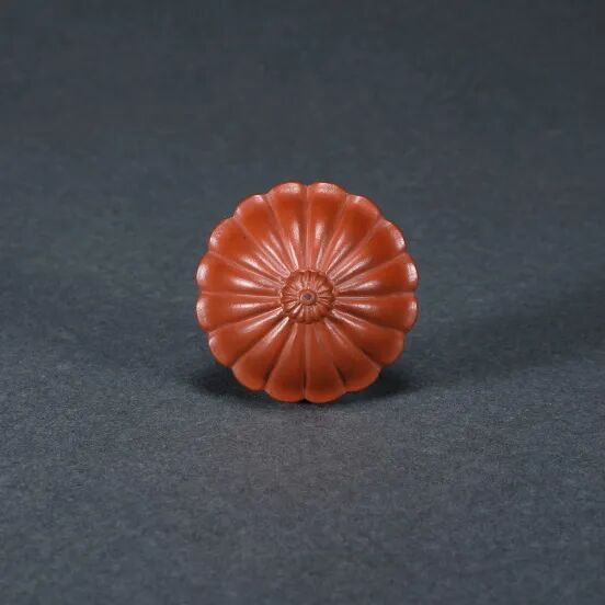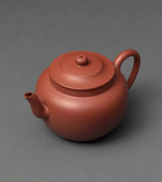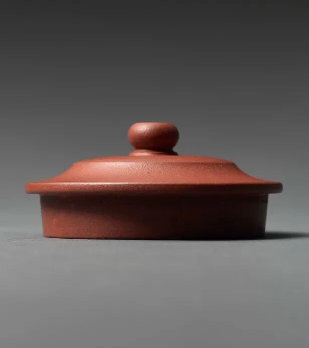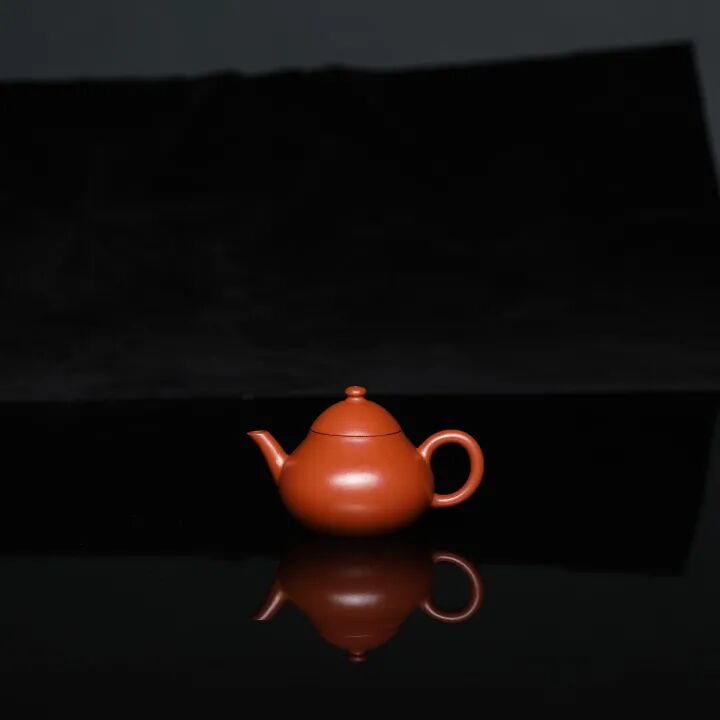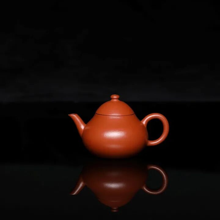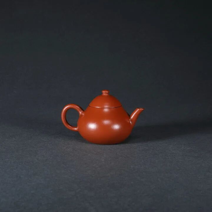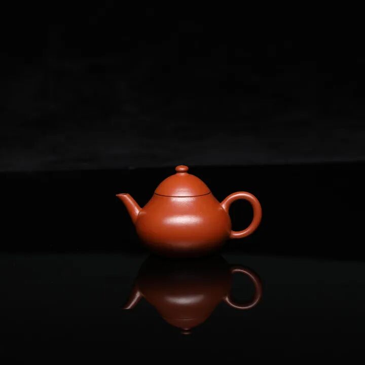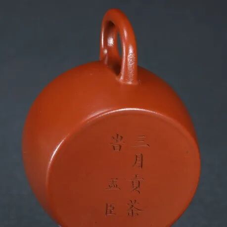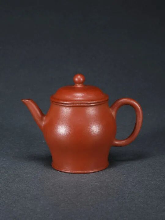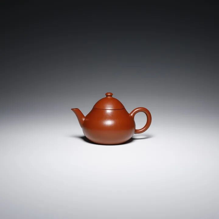 此壺用泥精純,窯溫適足發色殷红,轻巧精致。盖为笠帽式,口沿外撇,宝珠钮,流及把略微纤细,以凸显壶身的张力,同时于人玲珑美,具有鲜明时代特色。