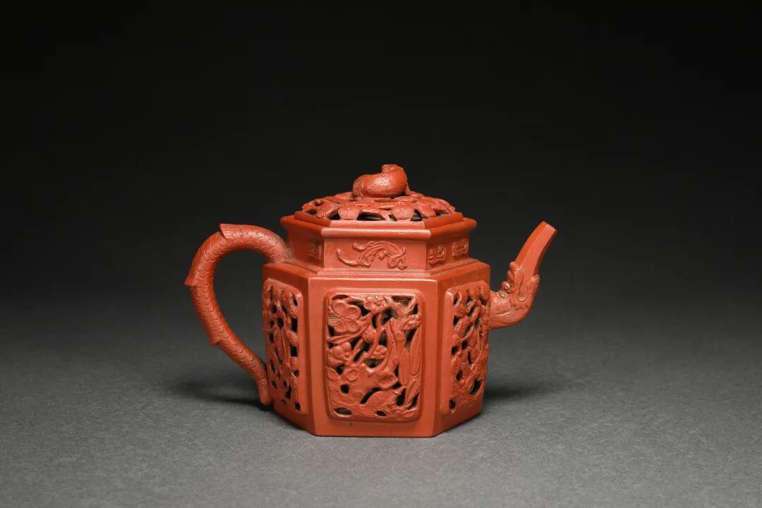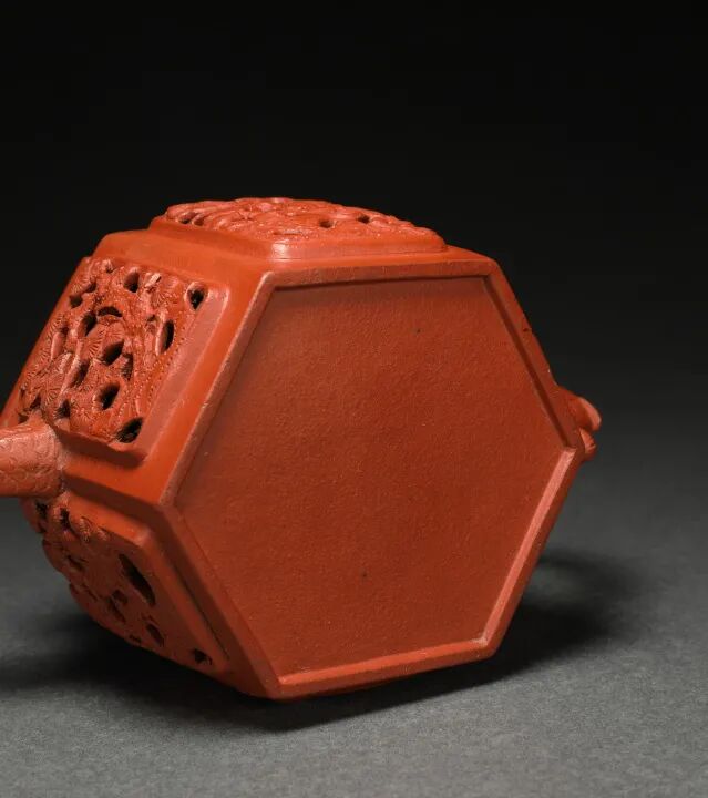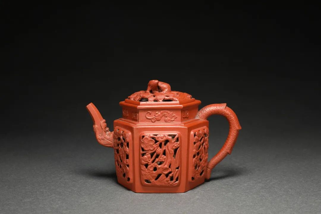 此壶为清早期典型外销欧洲壶式,壶身剔花纹饰多寓意吉祥,富有东方文明的智慧。朱砂胎质,通体呈六方形。六面立体开光,皆饰镂空梅花纹,六方形三弯流,其根部为龙首,龙身为把,鳞次栉比,曲折相间。高颈贴塑如意螭龙,雄姿逶迤。压盖式,壶盖饰以镂雕梅花纹,瑞兽为钮,整体堂皇庄丽,繁华溢彩,极具装饰性效果。