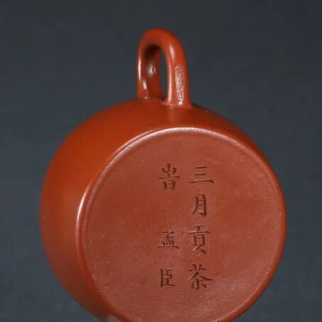 壶底刻 写楷体"三月貢茶春"落款"孟臣"字体雄健厚重。盖内镌"水平"二字,壶把钤"袁义和"椭圆章。