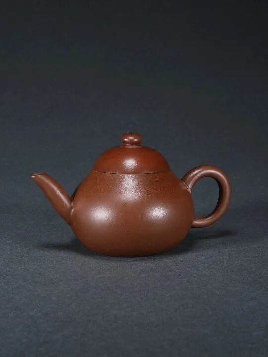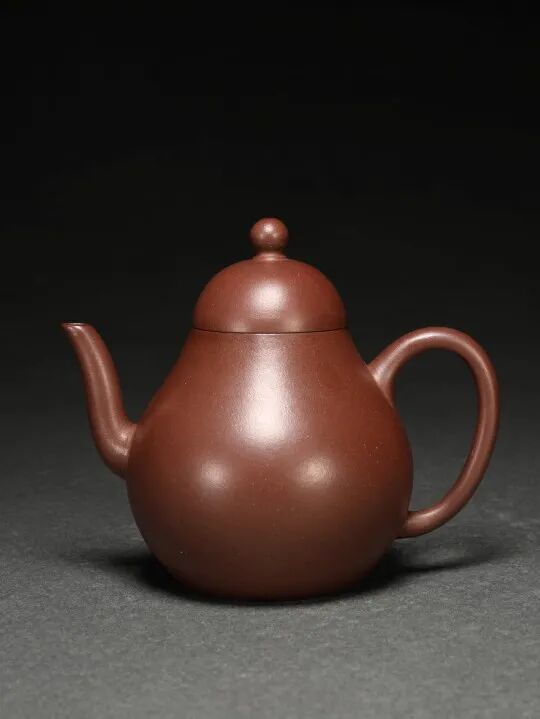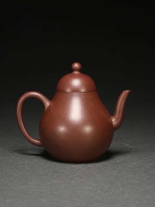 此壶为梨式壶之变体,壶腹极为饱满浑圆。以紫泥薄胎精工而制,更为珍罕,用泥细腻,深褐色胎体光润温和,质纯火到。观其线条,从钮至盖,从盖至身,一气呵成如顺流而下,骨肉亭匀,曲线优美,流把纤细,应乎其体。