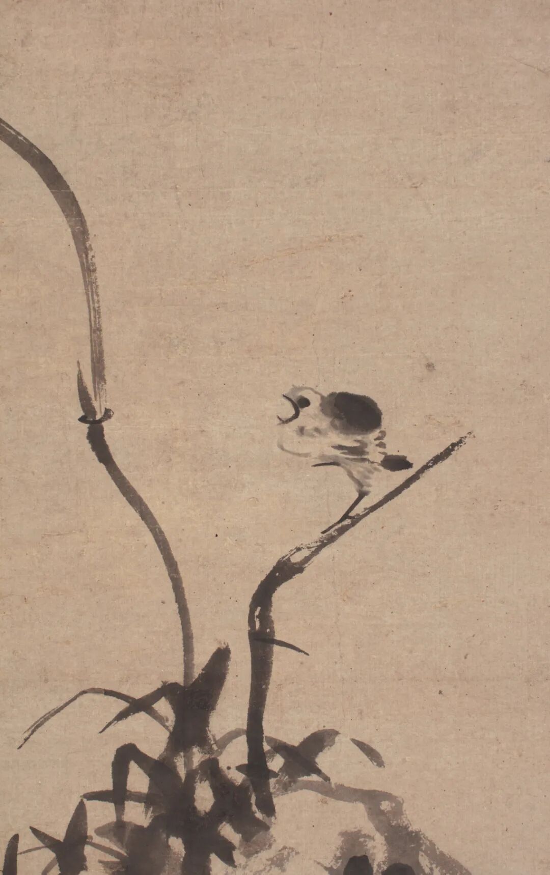 单腿站立的小鸟独立于竹枝之上,八大山人以浓墨墨点塑造鸟羽,以不同墨色线条勾画小鸟各部轮廓,以焦墨绘画其眼睛与鸟喙,浓淡刻画相宜,富有层次,小鸟的塑造不以细密为工,却又形体准确,鸟喙圆张,仿佛啼鸣,与上方竹叶遥相呼应,单腿站立的姿势给人以一触即飞之感。