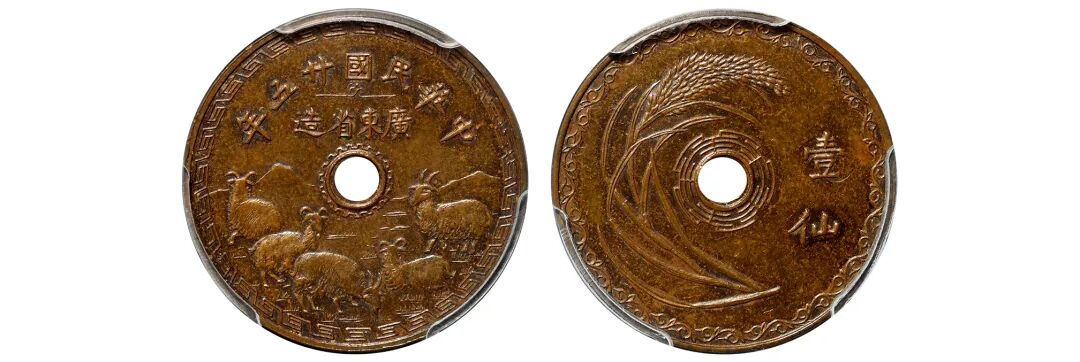 民国二十五年广东省造五羊图中孔台阶版壹仙铜币/PCGS SP63BN