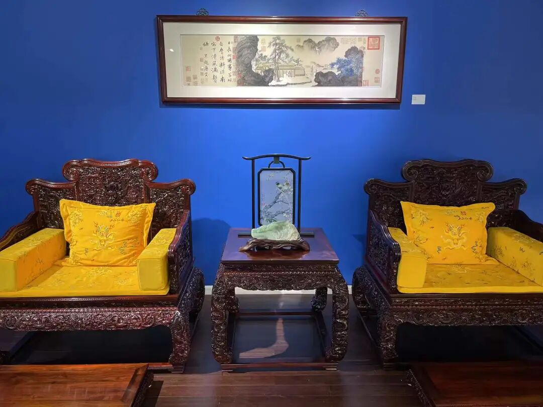 这套气势恢弘庄严的大红酸枝水云纹龙宝座五件套出自江苏省工艺美术行业协会副会长王剑秋之手。
