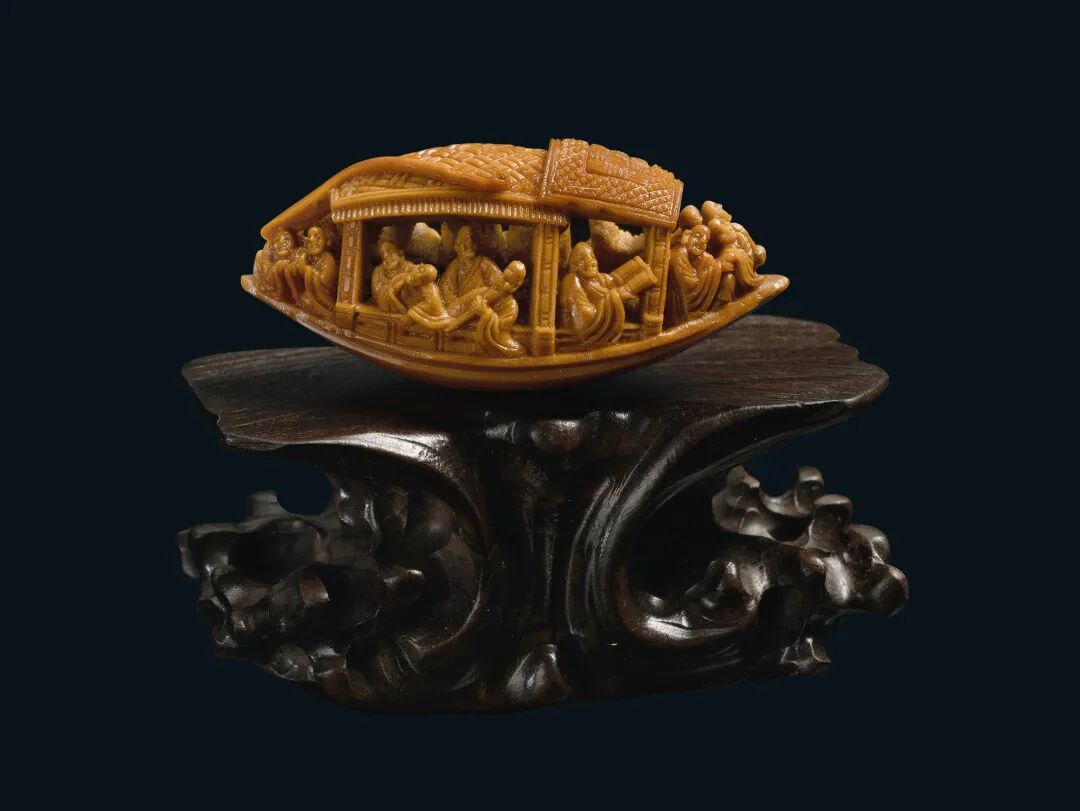 这是许忠英的另一件作品《十八罗汉舟》,核舟是核雕里面的传统经典题材,早在明朝就有名家王叔远作核舟记流传至今。这件作品作者运用多种雕刻工艺,充分利用核本身的形状,描述了传统佛家中的十八罗汉同坐游船的场景,十八位尊者形态各异,栩栩如生,毫发毕现,雕刻细腻。