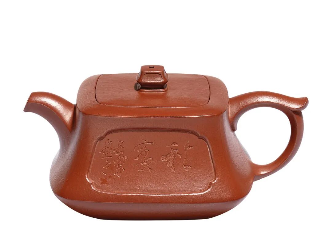 此壶以长四方柱础为创作素材,壶身内凹开光,铭文刻画装饰,以名贵朱泥制作,意取家园和谐美丽,此生长乐。