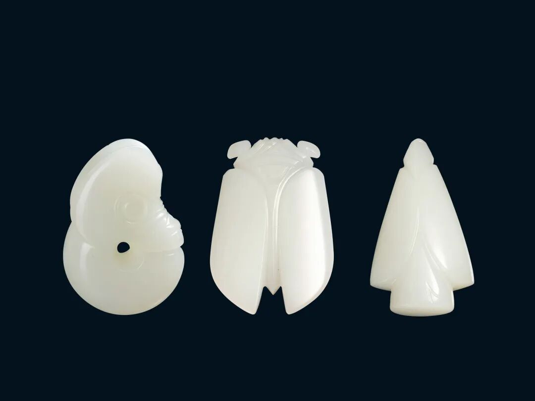 这件由中国工艺美术大师蒋喜雕刻的《美石三宝》作品由蝉、猪龙、翁仲组成,作者在师古的基础上,继承并发扬了千年的“汉八刀”等雕刻技法,使作品加入了对古代玉雕点、线、面的再认识。在造型和细部的表述方面融入了当代的印记,作品在不失神似的基础上努力创新,力求简洁大气用古代的刀法结合现代的工艺,雕出“古韵新风”的当代作品。