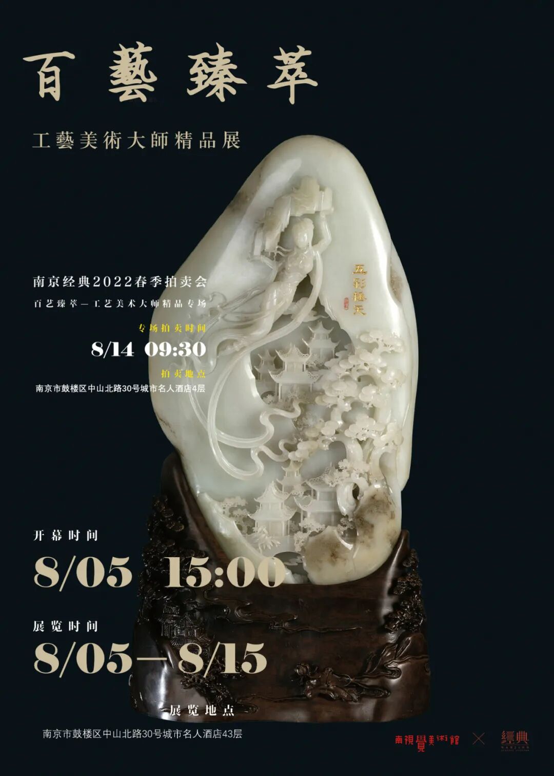 南京经典拍卖有限公司一直致力于民族艺术文化的继承和发扬,此次非常荣幸与江苏省工艺美术行业协会共同合作,联合举办南京经典2022春季拍卖会《百艺臻萃——工艺美术大师精品专场》,本次专场将作为展现江苏省工艺美术行业高水平的一场文化盛会,带来了广泛的文化典故和题材,运用了多种精妙的工艺技法,汇聚了国家级、省级、市级的各位优秀工艺美术大师为我们呈现多种形式的工艺美术作品。