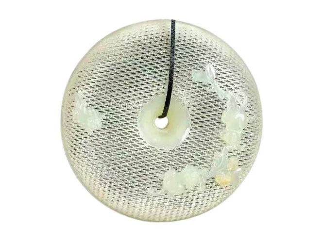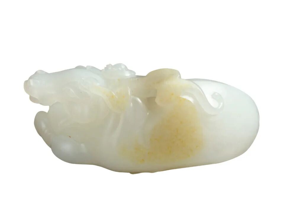 作品《马上封侯》选材新疆和田籽料,玉质温润细腻,白度上佳,表面带洒金皮,皮色清丽。圆雕一马跪卧于地,膘肥体壮,温顺乖巧。调皮猴儿攀附于马背,作嬉戏状,轻抚马头,天真有趣。作品线条圆润,形象逼真,富于张力,纹理刻画繁简有致,寥寥数刀,刻画出骏马饱满结实的肌肉,于细节处又雕琢入微,马鬃和马繮等处的细阴刻线一丝不苟。作者将动物的神态把握恰到好处,结合马、猴的题材,又因「猴」与「侯」谐音,取「马上封侯」之意,寓官运亨通,仕途顺达。