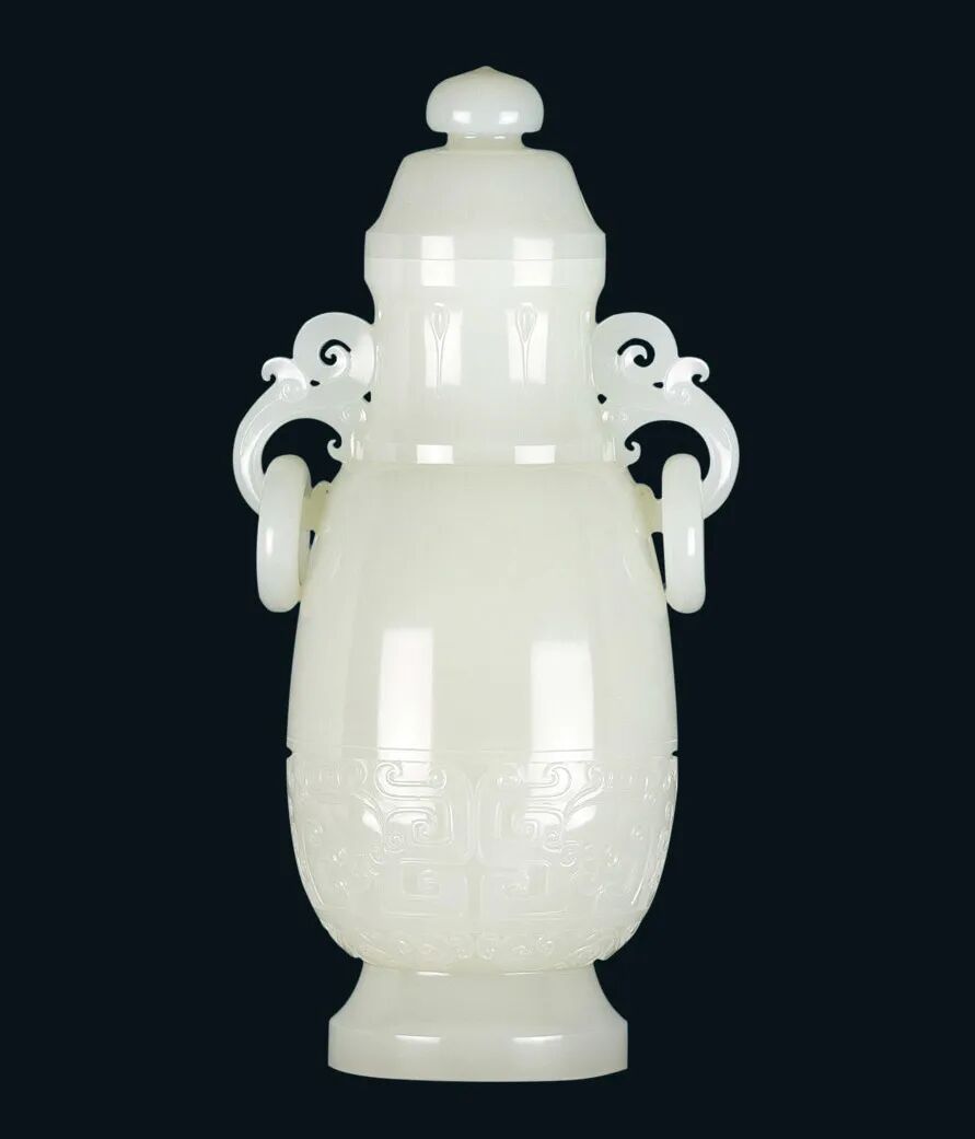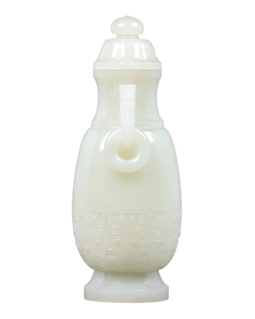 作品选用和田白玉资料雕刻,玉质细腻白皙润感十足,圆润饱满的瓶身厚重典雅。圆塔尖瓶顶溜肩下滑至瓶身,饱满的线条一气呵成自然天成含有张力,配以活环点缀增添灵动美感。瓶盖与瓶身雕刻八面水纹符以祈福平安美好,配上瓶身的传统饕餮纹彰显古典庄重感。