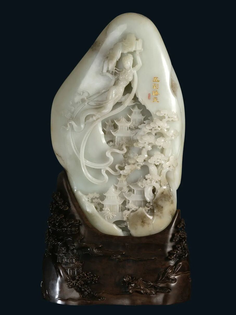 采用和田白玉,玉细腻缜密,油润丰洁,形体优美,大师以其鬼斧神工,将秀丽山川、琼楼玉宇和谐统一的人间仙境,与乾坤崩摧、天河倒悬的惊悚场景,融入同幅画面之中,而女娲氏素衣飞天,罗带曳地,双手举五彩神石,凌空补天,其绝世风华,漫布时空,而义勇仁慈,千秋永在,浩然正气,万古长存,给人以无比强烈的视觉冲击和精神震撼。此作品荣获2010年第五届中国玉雕精品「百花玉缘杯」金奖!
