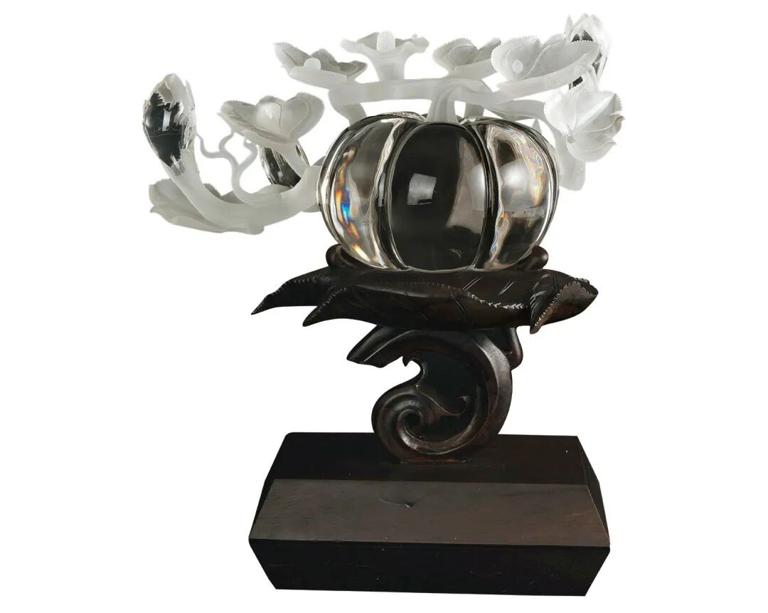 此件《大业有成》 是由天然无色水晶雕刻而成,晶体澄澈无暇,晶莹明亮,主题层次清晰,布局疏密有致。南瓜器形硕大圆满,藤蔓缠绕而生,叶片大而舒展。静中有动,动静结合。