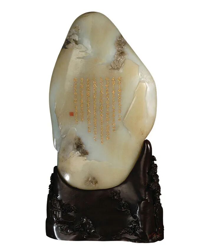 中国工艺美术大师高毅进创作的《圣思桃杯》古雅端庄,制作精湛,生机盎然,妙趣天成。「桃是万木之精」,可以用来辟邪。「麻姑献寿」、「蟠桃献寿」、「仙桃三千年一结实」等民间故事和神话传说更是家喻户晓,故桃形寓意福寿,作桃洗可引发诸多美好的联想。此作取材和田籽料,以肥硕半桃为杯,桃尖作流,口沿及内外壁 光洁清润。环衬在桃洗外壁的是其枝叶,枝干上的大小桃叶参差扶疏,紧贴洗壁,飘逸如生。枝端粗壮处一双喜鹊收翅栖息于上,对望共食一虫,温馨可人,充满生气。