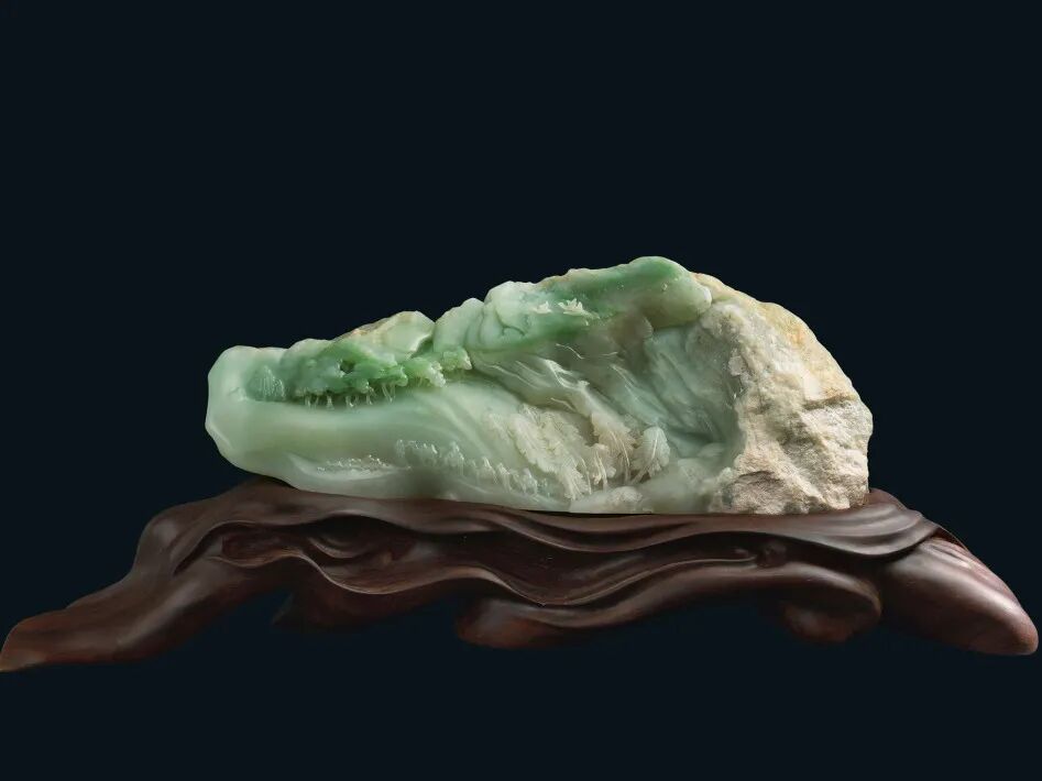 俄罗斯翠青,有一般白玉的凝重,又有翡翠绿色的鲜活,其绿色附在白底上,似春天枝头的嫩芽,给人以生机盎然、蓬勃向上的感觉。钟爱这难得的好材料,思虑再三,结合原料上一块白色肉质——绘出晴空万里,归雁盘旋,商贩驼队缓缓行过沙漠绿洲,遥看常年不化的雪山,宛如世外桃源。作品白翠相间,相得益彰,加之精细的做工雕刻,更凸显原料的难得,大漠绿洲,积雪如银,绿洲深处听驼铃。