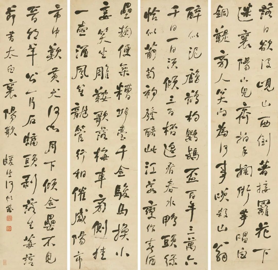 何绍基(1799 - 1873)以融合篆隶北碑众体自成一家,成为晚清书法碑学运动的领袖。此行草四条屏写李太白《襄阳诗》,是其晚年最具个人风格的典型面目。把篆隶古意融入行草是何绍基在书法史上的突破。何绍基尝言:「书家须自立门户,其旨在熔铸古人,自成一家,否则习气未除,将至性至情不能表见于笔墨之外。」何绍基一生遍习正草篆隶,修炼至此已化茧成蝶,成就此四联之上非常自由又法度自在的样子,老辣苍茫,满纸神机。