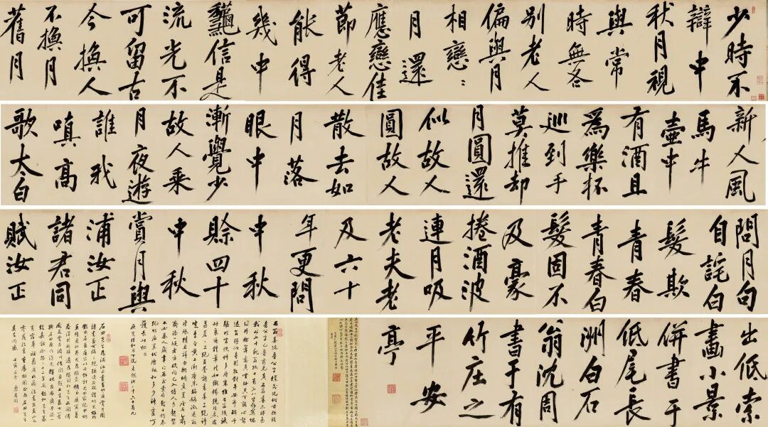 (一)石田先生中秋赏月之作,画如李唐,诗如白香山,字如黄涪翁,可称三绝。先生每历佳境辄作一图,如余所见东园看花图,山居煮雪图,竹堂寺看梅图,冬游虎丘图,皆写难写之景,如在目前,可比杜少陵自成都入秦诸诗。故内散出名画,唐宋以千馀计,元四家绝少,明画惟见此卷。己酉中秋前一日阅于砚山斋桂花傍。钤印:长宜子孙、孙承泽印