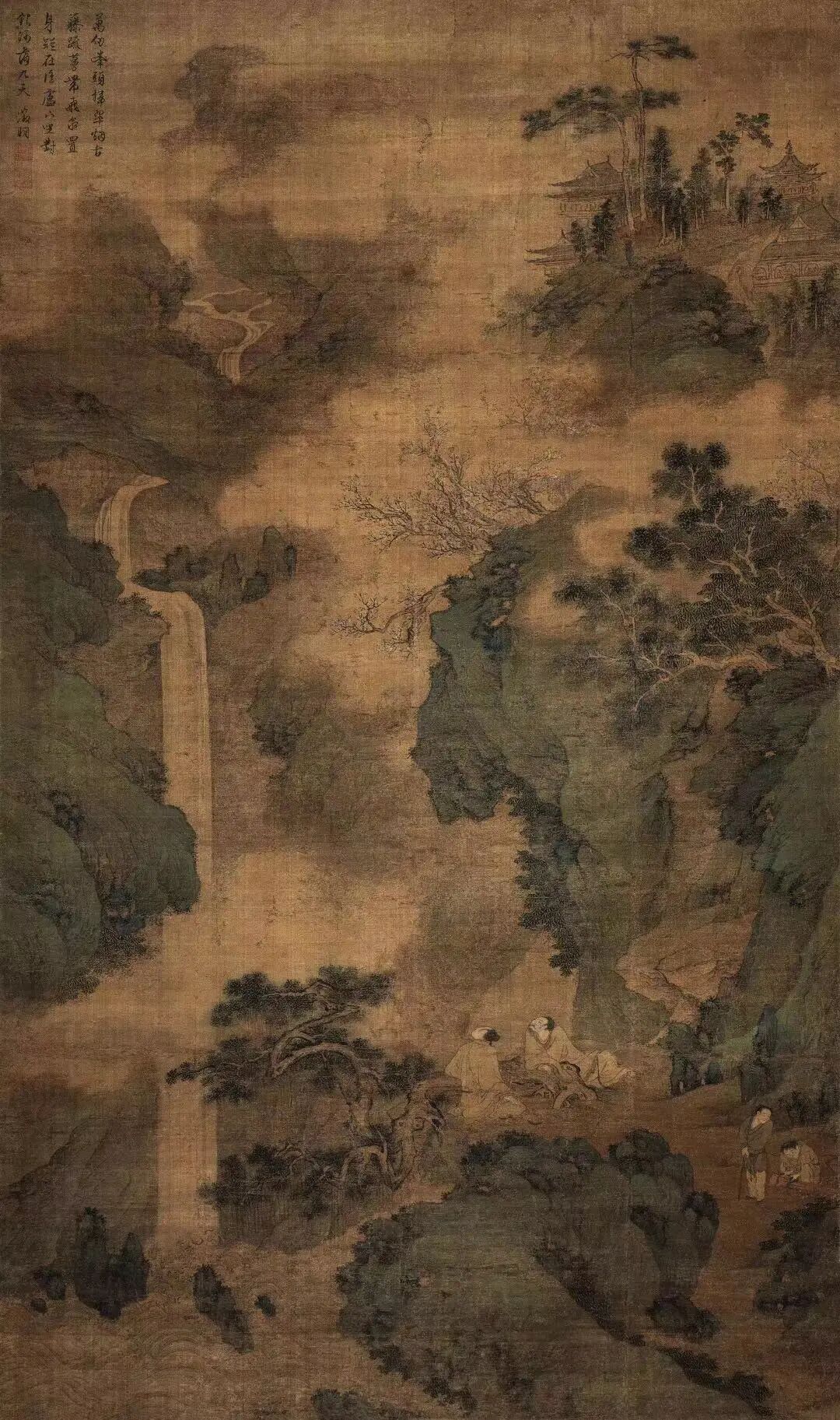 【款识】万仞峰头扫翠烟,古藤疏蔓带飞泉。置身疑在匡庐下,坐对银河落九天。徵明。